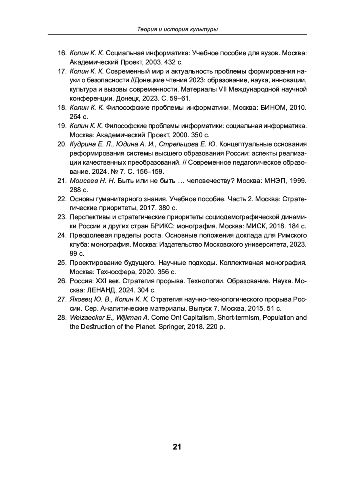 19. Колин К. К. Фундаментальные основы информатики: социальная информатика. Москва: Академический Проект, 2000. 350 с. EDN: VROUCP
