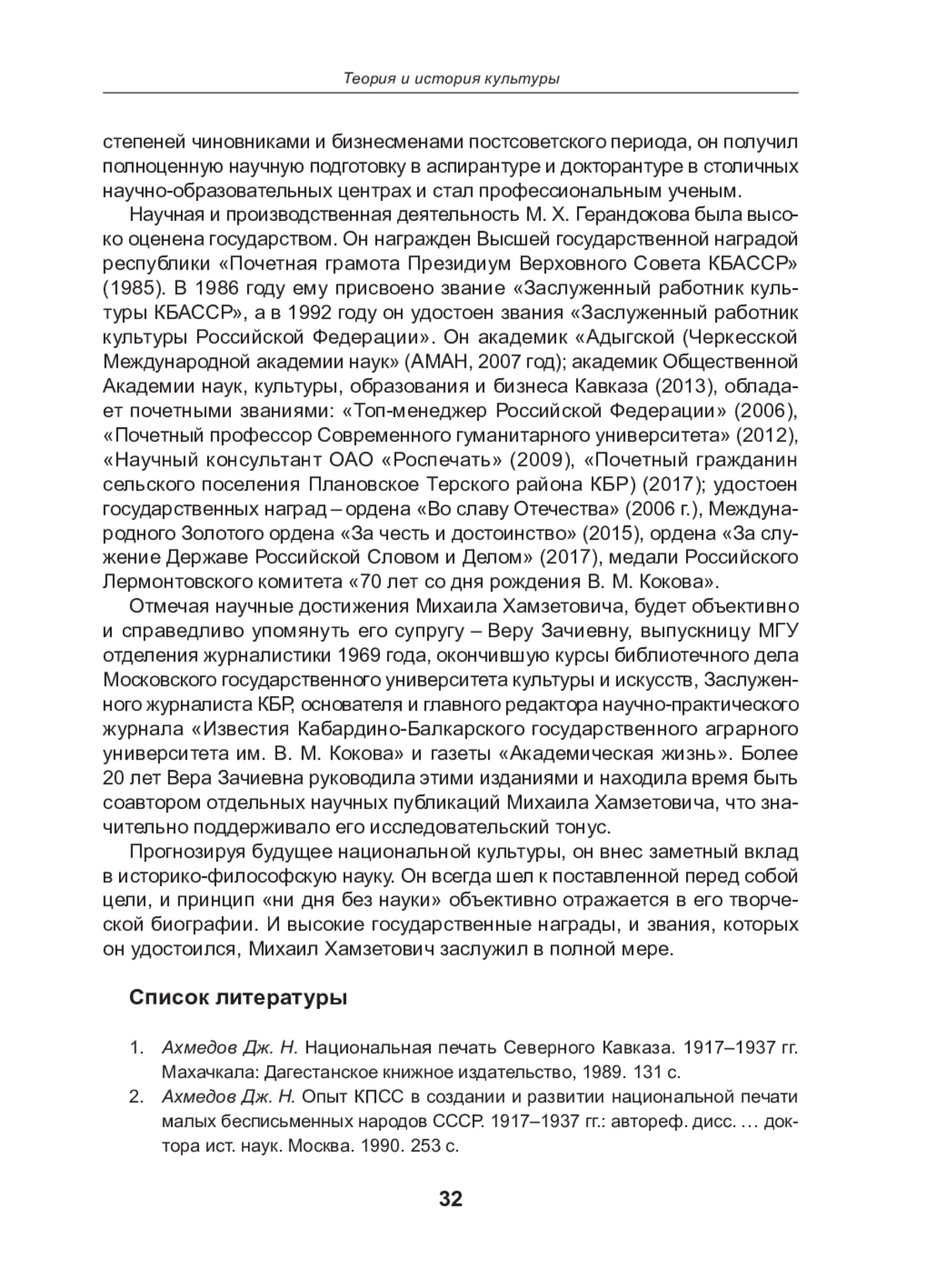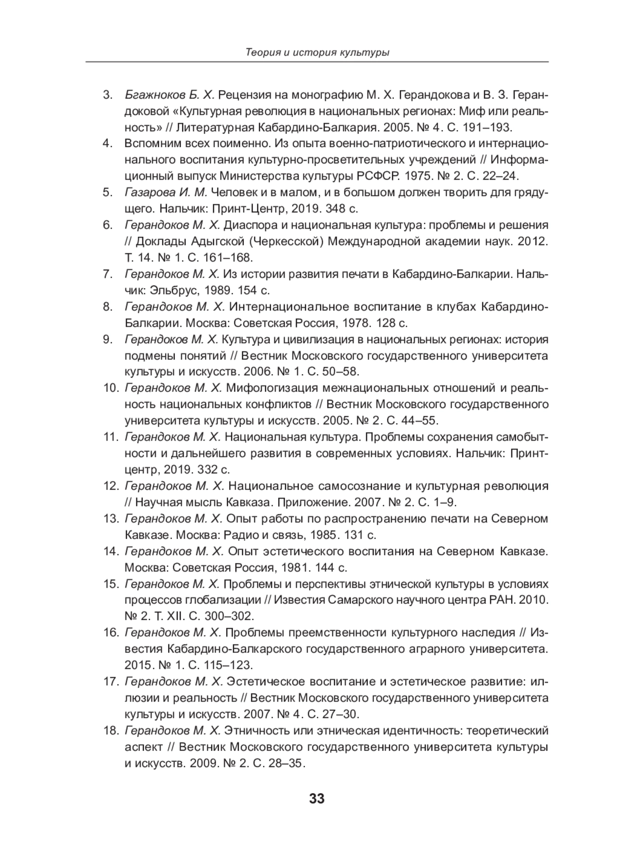 11. Герандоков М. Х. Национальная культура. Проблемы сохранения самобытности и дальнейшего развития в современных условиях. Нальчик: Принтцентр, 2019. 332 с.