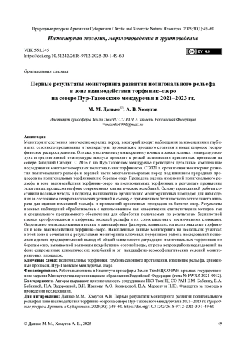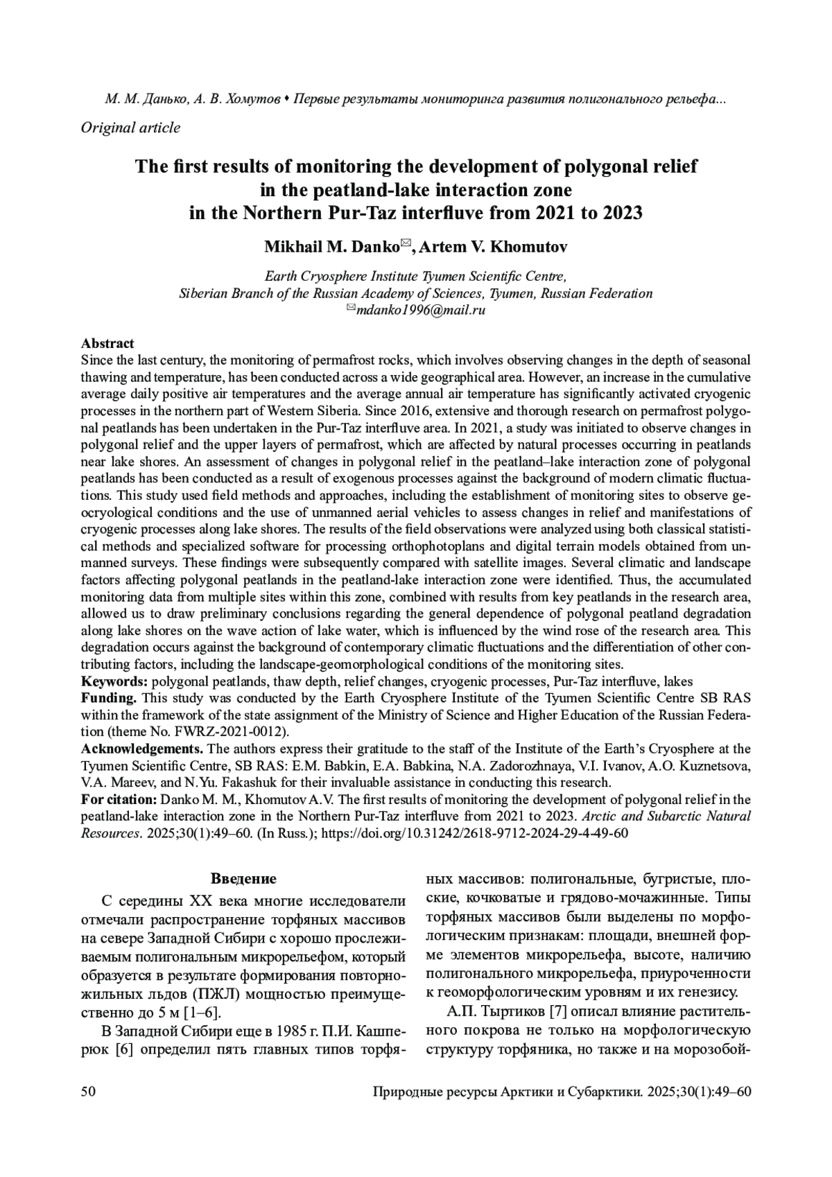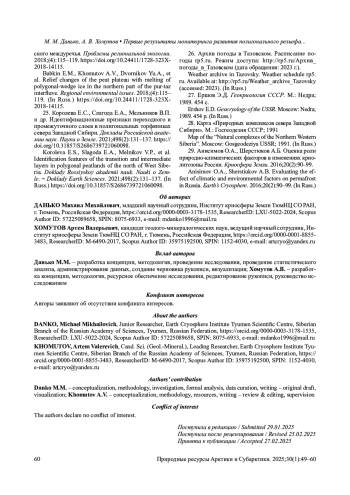 14. Хомутов А.В., Бабкин Е.М., Тихонравова Я.В. и др. Комплексные исследования криолитозоны северовосточной части Пур-Тазовского междуречья. Научный вестник Ямало-Ненецкого АО. 2019;1(102):53-64. DOI: 10.26110/ARCTIC.2019.102.1.008