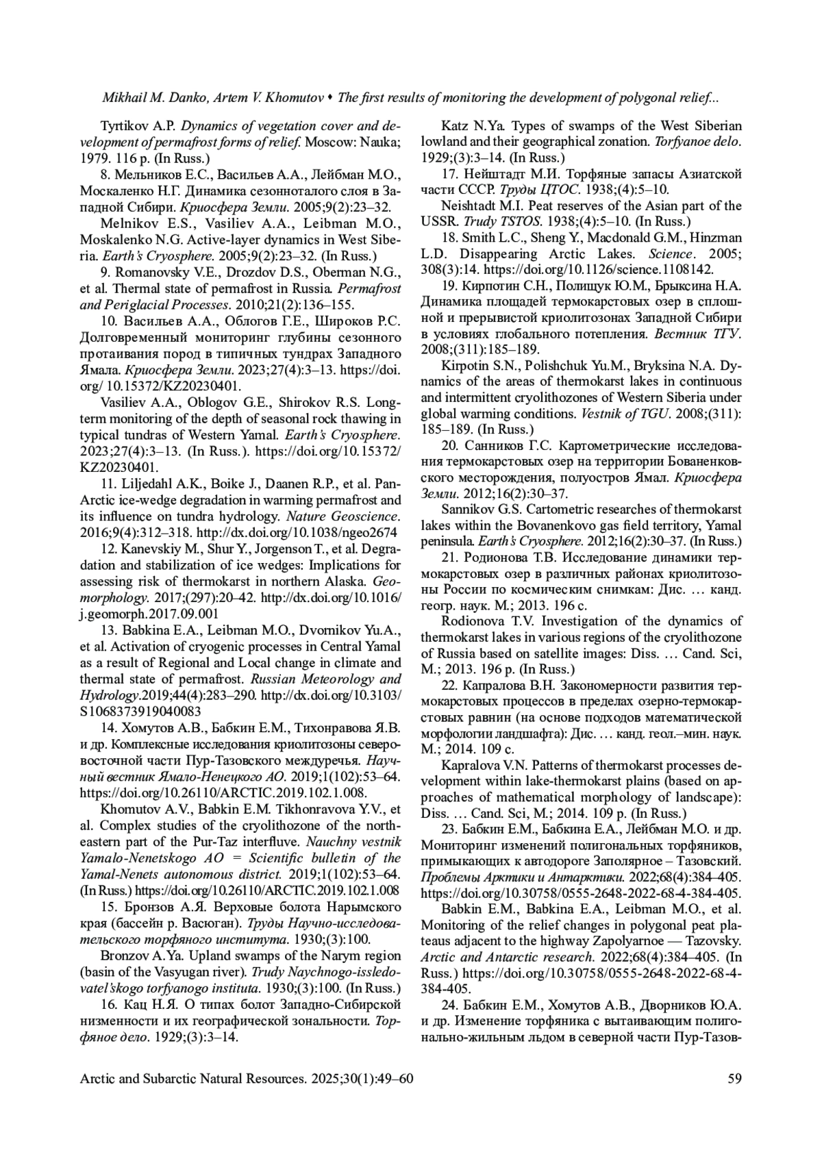 23. Бабкин Е.М., Бабкина Е.А., Лейбман М.О. и др. Мониторинг изменений полигональных торфяников, примыкающих к автодороге Заполярное - Тазовский. Проблемы Арктики и Антарктики. 2022;68(4):384-405. DOI: 10.30758/0555-2648-2022-68-4-384-405