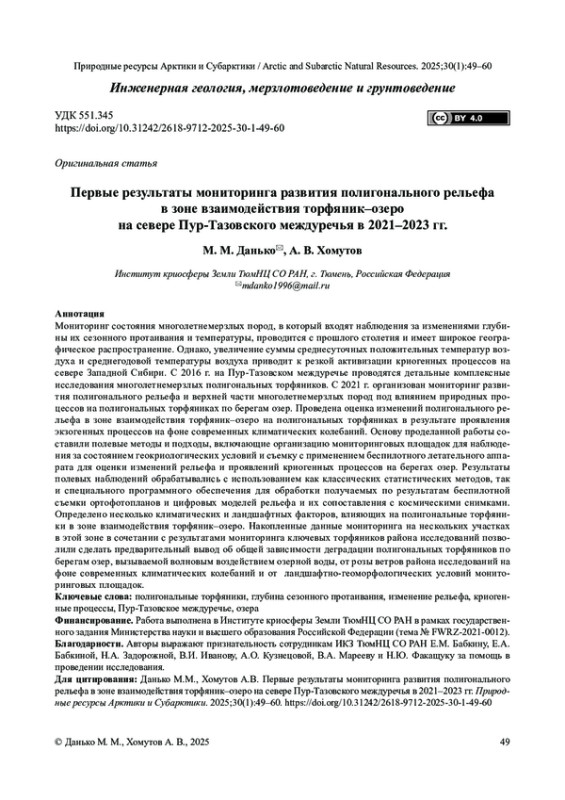 Мониторинг состояния многолетнемерзлых пород, в который входят наблюдения за изменениями глубины их сезонного протаивания и температуры, проводится с прошлого столетия и имеет широкое географическое распространение. Однако, увеличение суммы среднесуточных положительных температур воздуха и среднегодовой температуры воздуха приводит к резкой активизации криогенных процессов на севере Западной Сибири. С 2016 г. на Пур-Тазовском междуречье проводятся детальные комплексные исследования многолетнемерзлых полигональных торфяников. С 2021 г. организован мониторинг развития полигонального рельефа и верхней части многолетнемерзлых пород под влиянием природных процессов на полигональных торфяниках по берегам озер. Проведена оценка изменений полигонального рельефа в зоне взаимодействия торфяник–озеро на полигональных торфяниках в результате проявления экзогенных процессов на фоне современных климатических колебаний. Основу проделанной работы составили полевые методы и подходы, включающие организацию мониторинговых площадок для наблюдения за состоянием геокриологических условий и съемку с применением беспилотного летательного аппарата для оценки изменений рельефа и проявлений криогенных процессов на берегах озер. Результаты полевых наблюдений обрабатывались с использованием как классических статистических методов, так и специального программного обеспечения для обработки получаемых по результатам беспилотной съемки ортофотопланов и цифровых моделей рельефа и их сопоставления с космическими снимками. Определено несколько климатических и ландшафтных факторов, влияющих на полигональные торфяники в зоне взаимодействия торфяник–озеро. Накопленные данные мониторинга на нескольких участках в этой зоне в сочетании с результатами мониторинга ключевых торфяников района исследований позволили сделать предварительный вывод об общей зависимости деградации полигональных торфяников по берегам озер, вызываемой волновым воздействием озерной воды, от розы ветров района исследований на фоне современных климатических колебаний и от ландшафтно-геоморфологических условий мониторинговых площадок.