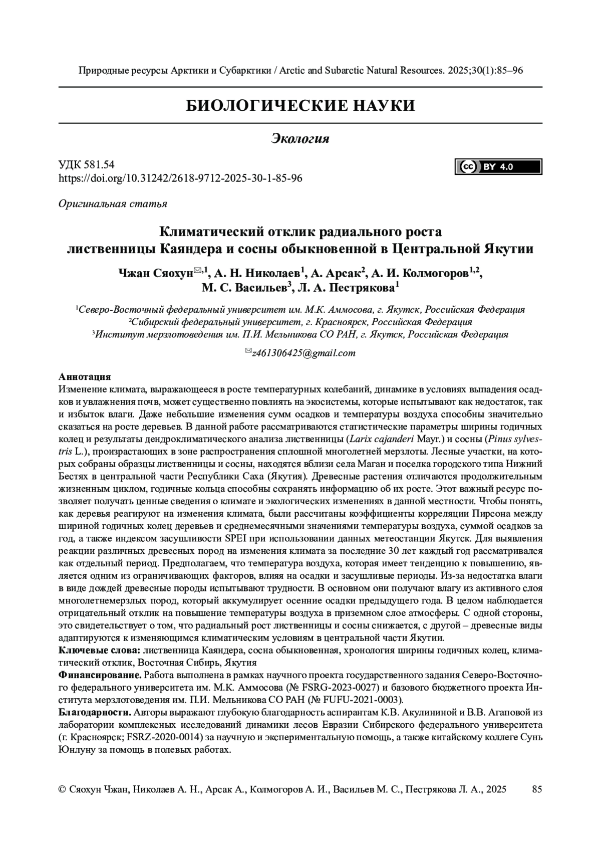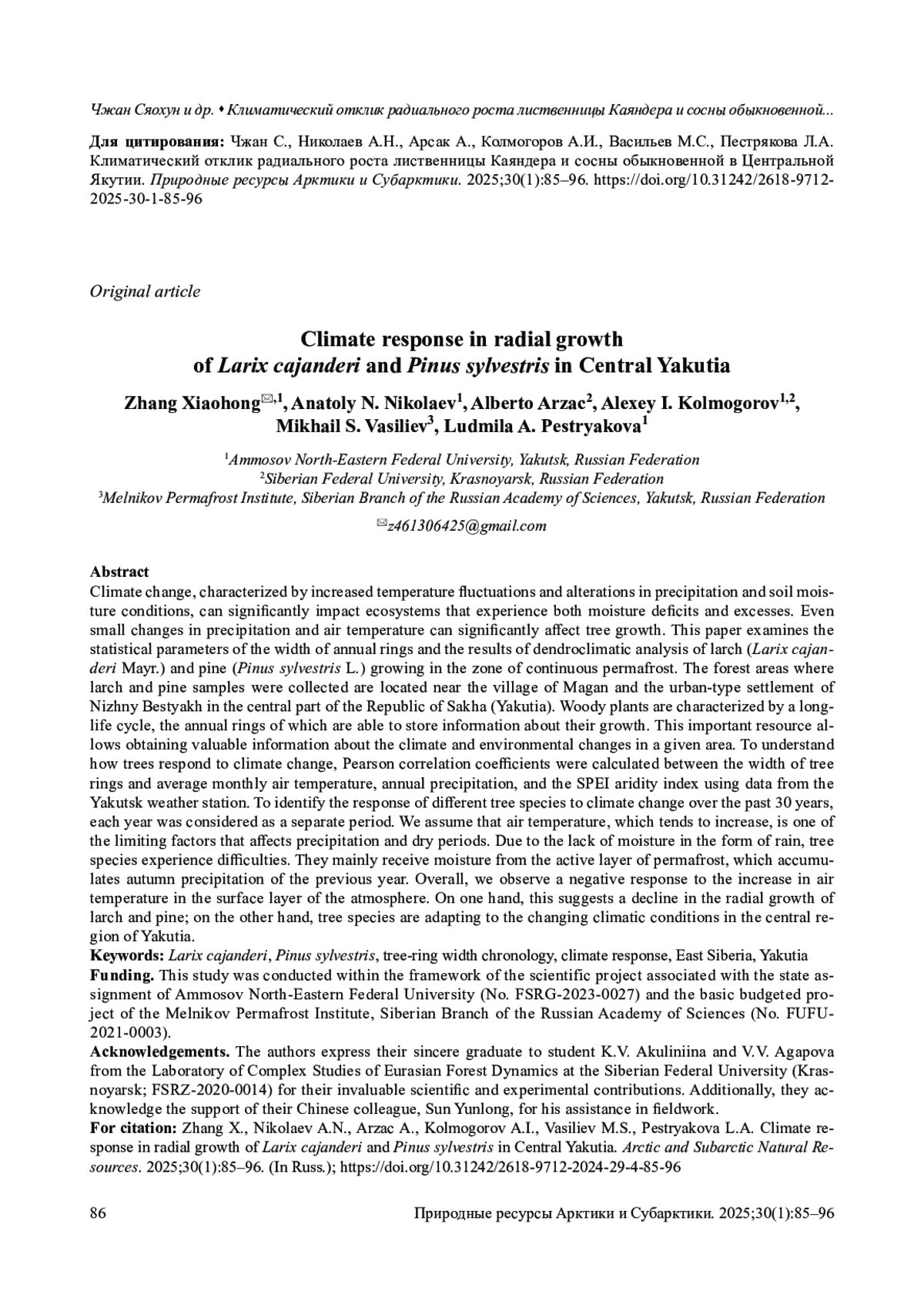 32. Zhang X.H., Nikolaev A.N., Kolmogorov A.I., et al. The Influence of Hydrothermal Moistening on the Radial Growth of Larch in Central Yakutia. Moscow University Biological Sciences Bulletin. 2024;79(2):101- 106.
