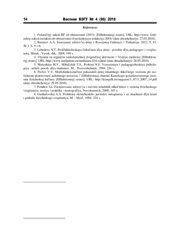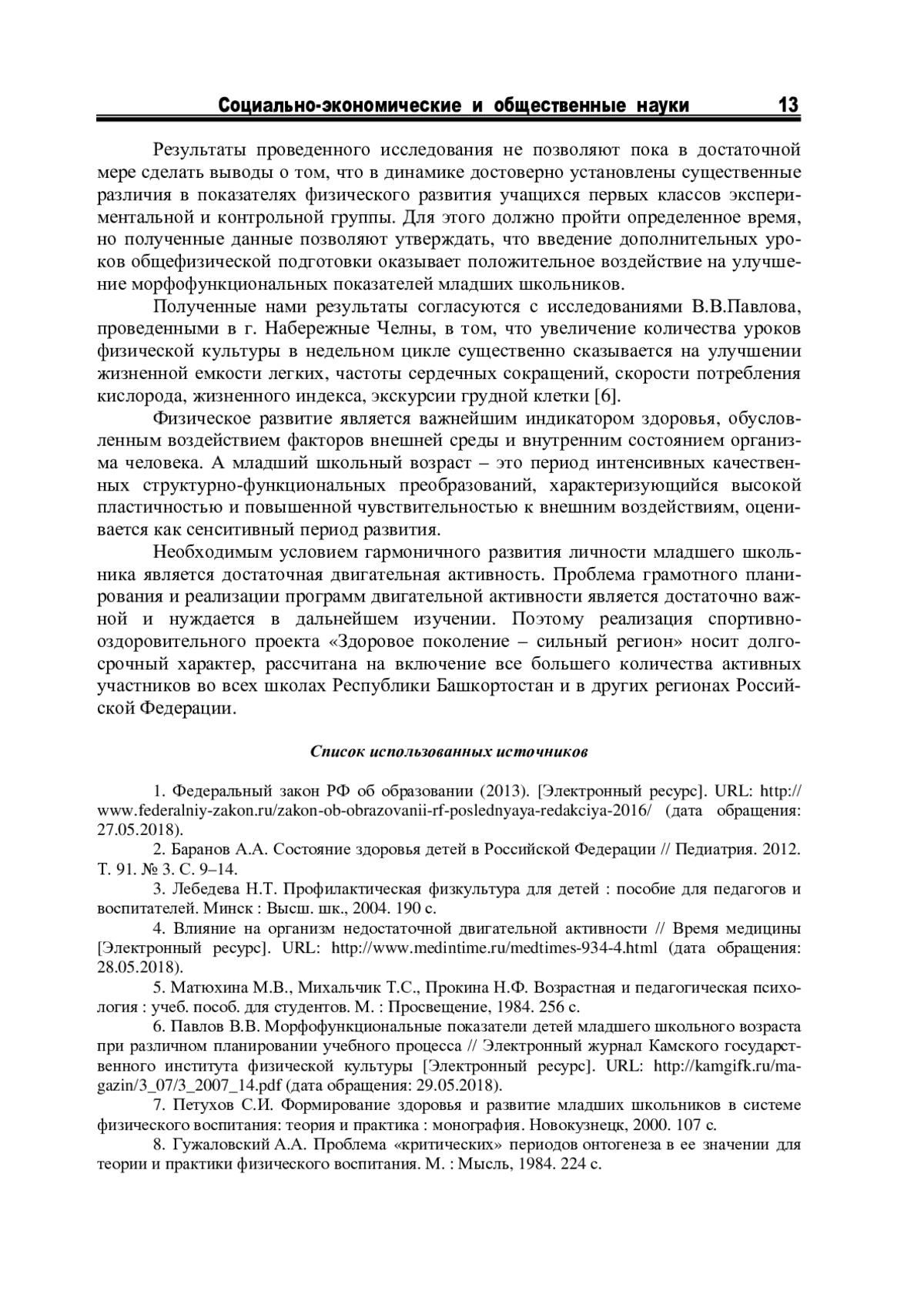 6. Павлов В.В. Морфофункциональные показатели детей младшего школьного возраста при различном планировании учебного процесса // Электронный журнал Камского государственного института физической культуры [Электронный ресурс]. URL: http://kamgifk.ru/magazin/3_07/3_2007_14.pdf (дата обращения: 29.05.2018).