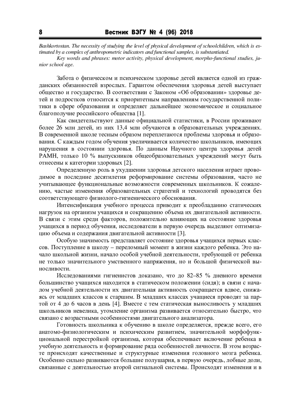Статья раскрывает роль двигательной активности младших школьников как важнейшего условия гармоничного развития личности ребенка. Представлены результаты морфофункциональных исследований учащихся первых классов, включенных в экспериментальную группу, в рамках реализации спортивно-оздоровительного проекта «Здоровое поколение – сильный регион» в Республике Башкортостан. Обоснована необходимость изучения уровня физического развития школьников, который оценивается комплексом антропометрических показателей и функциональных проб
