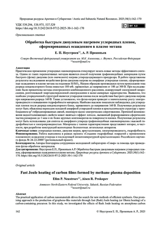 Практическое применение углеродных наноматериалов стимулирует искать новые методы эффективного синтеза. Одним из таких перспективных методов является способ получения графеноподобных материалов путем быстрого (флэш) джоулева (или омического) нагрева углеродсодержащего прекурсора. В работе представлены результаты исследования воздействия флэш-джоулева нагрева на аморфные углеродные пленки, сформированные осаждением в плазме метана на подложки Si/SiO2. Нагрев образцов производился путем пропускания тока разряда конденсаторного блока емкостью 180 мФ, заряженных до напряжения от 100 до 300 В. При исследованиях были привлечены методы спектроскопии комбинационного рассеяния, сканирующей электронной микроскопии, рентгеновской энергодисперсионной спектроскопии и вольт-амперных характеристик. Выявлено, что наиболее упорядоченной структурой является углеродная пленка после воздействия быстрого джоулева нагрева при напряжении разряда 160 В. Также установлено, что флэш-нагрев приводит к значительному росту электропроводности и повышению гидрофобности материала. Наиболее высокие показатели наблюдались для углеродных пленок после разряда конденсаторного блока, заряженного до напряжения 160 В. Полученные результаты могут быть объяснены переходом исходной аморфной углеродной пленки в кристаллическую структуру с преобладанием sp2-гибридизированных связей, имеющую малое электрическое сопротивление. Причиной возникновения водоотталкивающих свойств может являться «эффект лотоса», вызванный формированием сферических частиц размерами до 1 мкм и их более крупных конгломератов на поверхности пленки. Полученные результаты могут быть использованы для синтеза из аморфного углерода графеноподобных наноматериалов с высокой гидрофобностью и электропроводностью. Материалы с такими характеристиками представляют интерес, в частности, при разработке конструкций всепогодных беспилотных летательных аппаратов.