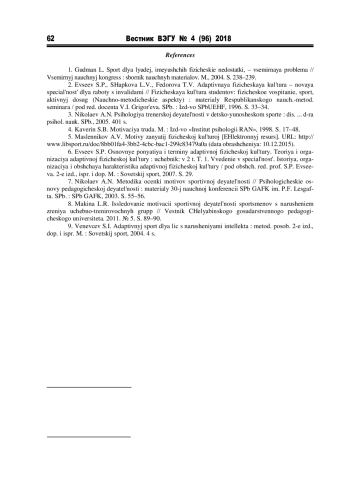 1. Гудман Л. Спорт для людей, имеющих физические недостатки, - всемирная проблема // Всемирный научный конгресс: сборник научных материалов. М., 2004. С. 238-239.