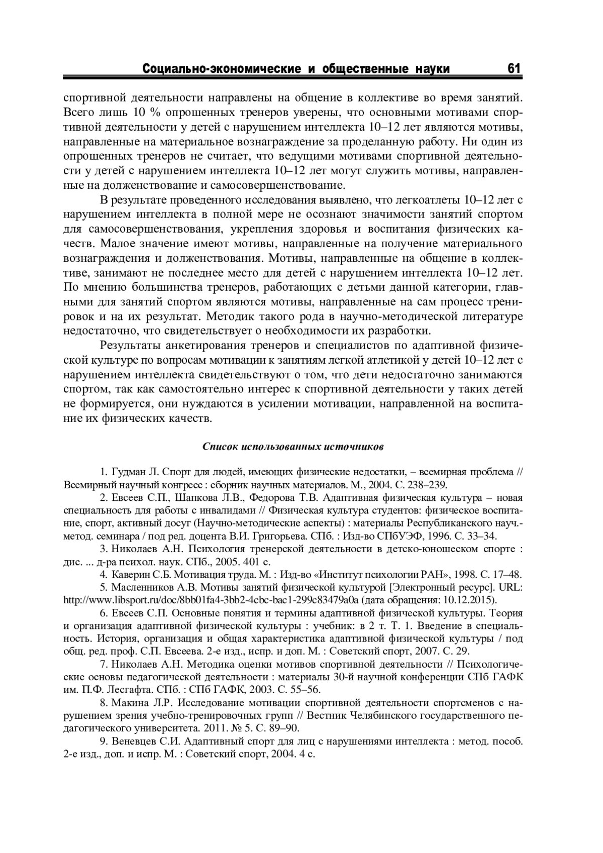 7. Николаев А.Н. Методика оценки мотивов спортивной деятельности // Психологические основы педагогической деятельности: материалы 30-й научной конференции СПб ГАФК им. П.Ф. Лесгафта. СПб.: СПб ГАФК, 2003. С. 55-56.