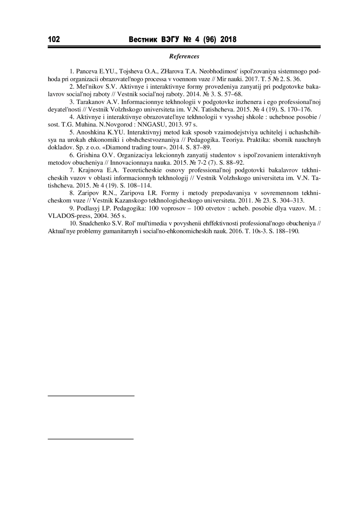8. Зарипов Р.Н., Зарипова И.Р. Формы и методы преподавания в современном техническом вузе // Вестник Казанского технологического университета. 2011. № 23. С. 304-313. EDN: ONAIIL