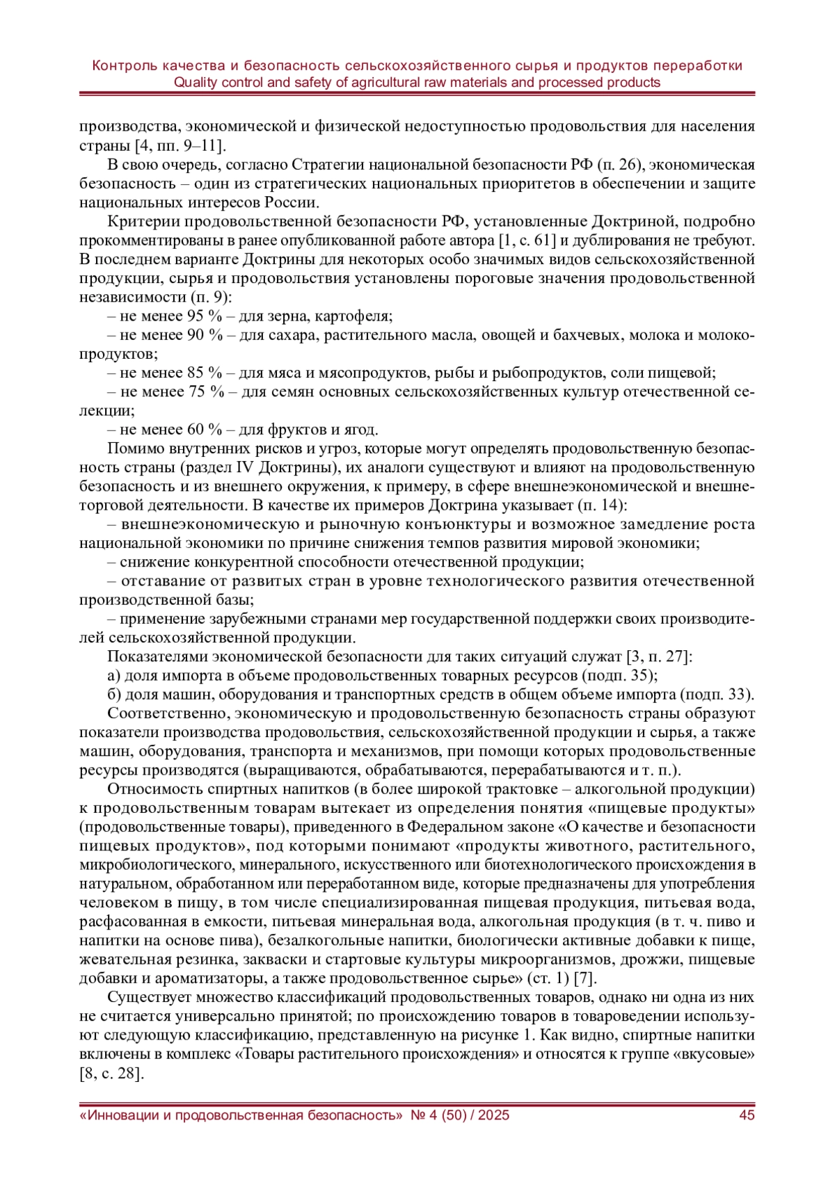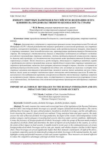 Анализируется содержание и современная правовая основа законодательства Российской Федерации и ЕАЭС о такой разновидности пищевых продуктов и алкогольной продукции, как спиртные напитки, указываются критерии, их характеризующие, виды продовольственных товаров, относящихся к спиртным напиткам, доли самообеспечения ими, гарантирующие продовольственную безопасность страны. На материале статистических данных и открытых источников исследовано состояние российского производства спиртных напитков, степень продовольственной независимости страны по данному виду продукта, его достаточности для решения задач продовольственной безопасности в современных условиях. Также отмечено в группе товаров, относящихся к спиртным напиткам, наряду с продуктами российского производства наличие определённого количества спиртных напитков иностранного производства, выявлена доля импорта указанного товара в стране, степень его влияния на продовольственную безопасность. Спецификой последних лет, несмотря на снижение в импорте доли спиртных напитков иностранного производства, является наличие таких напитков, как ром, джин, текила, виски, цены на которые значительно выше стоимости отечественных аналогов. В свете вышесказанного для поддержания паритета конкурентоспособности отечественных спиртных напитков на внутреннем рынке страны указаны меры государственного и таможенного регулирования (в том числе применяемые), достаточные для снижения конкурентных преимуществ иностранных спиртных напитков.