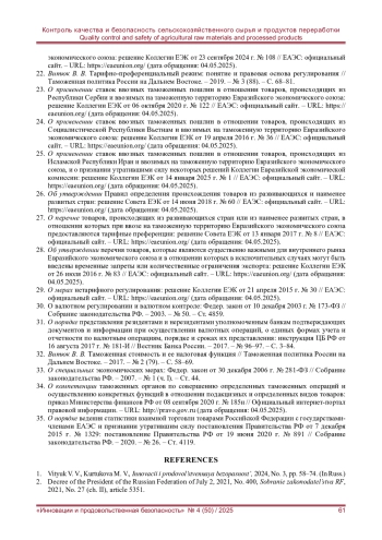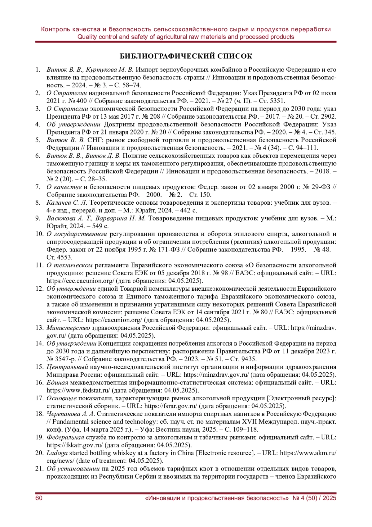 5. Витюк В. В. СНГ: рынок свободной торговли и продовольственная безопасность Российской Федерации // Инновации и продовольственная безопасность. - 2021. - № 4 (34). - С. 94-111. EDN: KCRTMS