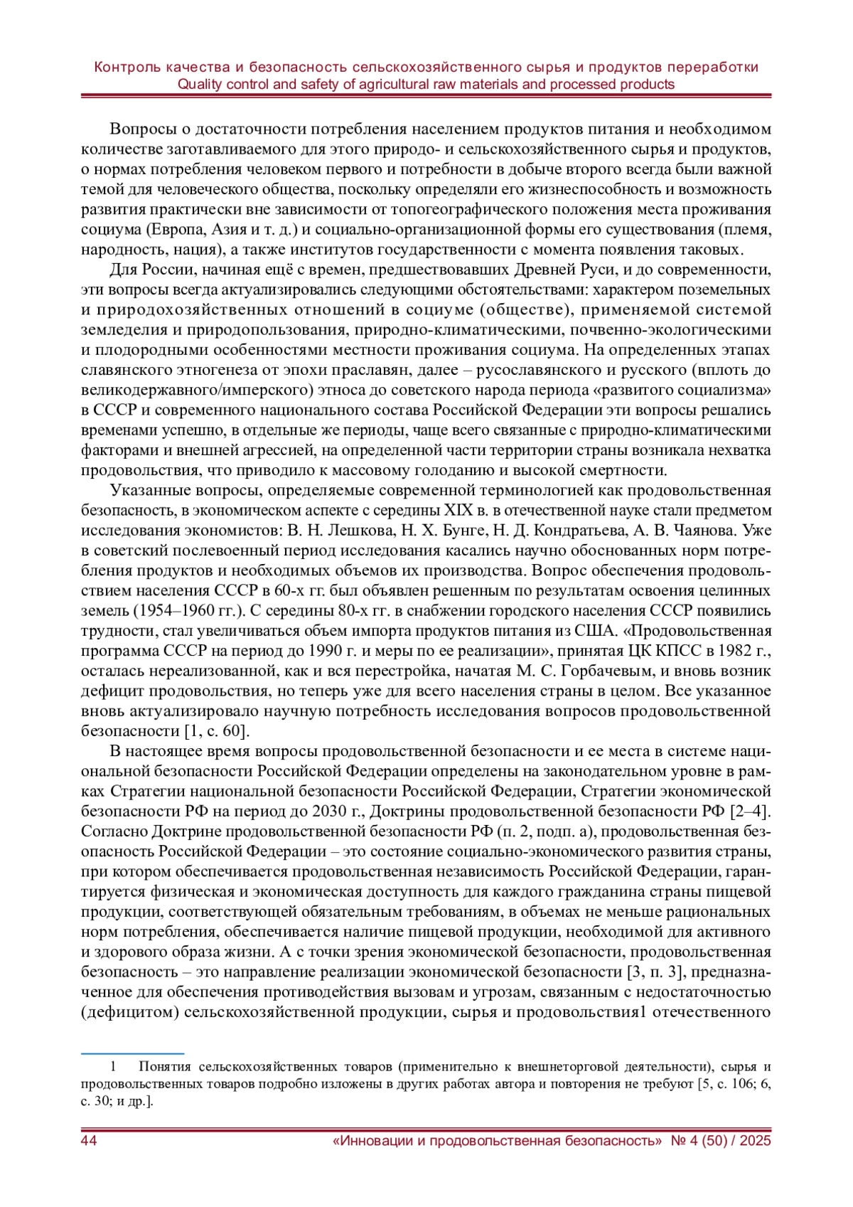 Указанные вопросы, определяемые современной терминологией как продовольственная безопасность, в экономическом аспекте с середины XIX в. в отечественной науке стали предметом исследования экономистов: В. Н. Лешкова, Н. Х. Бунге, Н. Д. Кондратьева, А. В. Чаянова. Уже в советский послевоенный период исследования касались научно обоснованных норм потре‑ бления продуктов и необходимых объемов их производства. Вопрос обеспечения продоволь‑ ствием населения СССР в 60‑х гг. был объявлен решенным по результатам освоения целинных земель (1954–1960 гг.). С середины 80‑х гг. в снабжении городского населения СССР появились трудности, стал увеличиваться объем импорта продуктов питания из США. «Продовольственная программа СССР на период до 1990 г. и меры по ее реализации», принятая ЦК КПСС в 1982 г., осталась нереализованной, как и вся перестройка, начатая М. С. Горбачевым, и вновь возник дефицит продовольствия, но теперь уже для всего населения страны в целом. Все указанное вновь актуализировало научную потребность исследования вопросов продовольственной безопасности [1, с. 60].