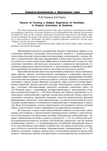 В статье анализируются сущностные особенности субъектного опыта фасилитации у студентов педагогического вуза. Рассматриваются факторы его развития в сменяющихся ролях-позициях обучающихся посредством последовательной организации полемического взаимодействия как развивающей многоголосой среды. Характеризуется модель поэтапного формирования субъектного опыта фасилитатора: «облегчающей» перцепции, организованной рефлексии, конструктивной критики и «помогающего» стиля управления полемикой