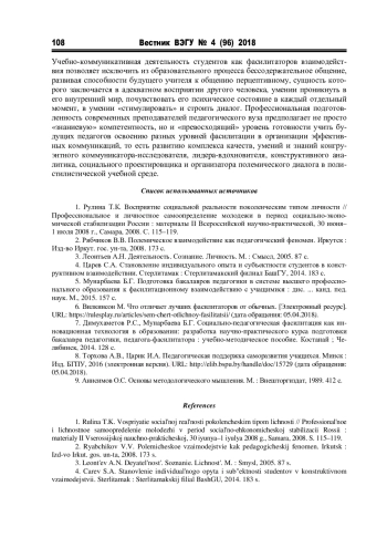 5. Мунарбаева Б.Г. Подготовка бакалавров педагогики в системе высшего профессионального образования к фасилитационному взаимодействию с учащимися: дис.. канд. пед. наук. М., 2015. 157 с. EDN: ZPWREL
