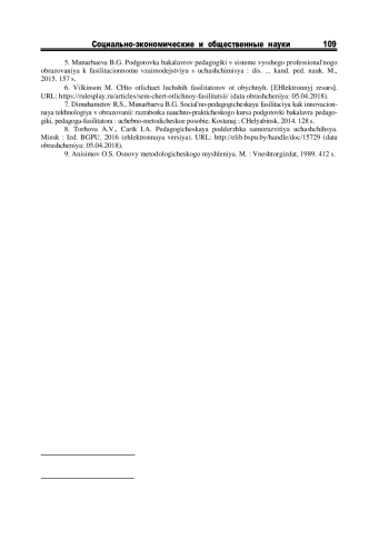 7. Димухаметов Р.С., Мунарбаева Б.Г. Социально-педагогическая фасилитация как инновационная технология в образовании: разработка научно-практического курса подготовки бакалавра педагогики, педагога-фасилитатора: учебно-методическое пособие. Костанай; Челябинск, 2014. 128 с. EDN: TTPMBX