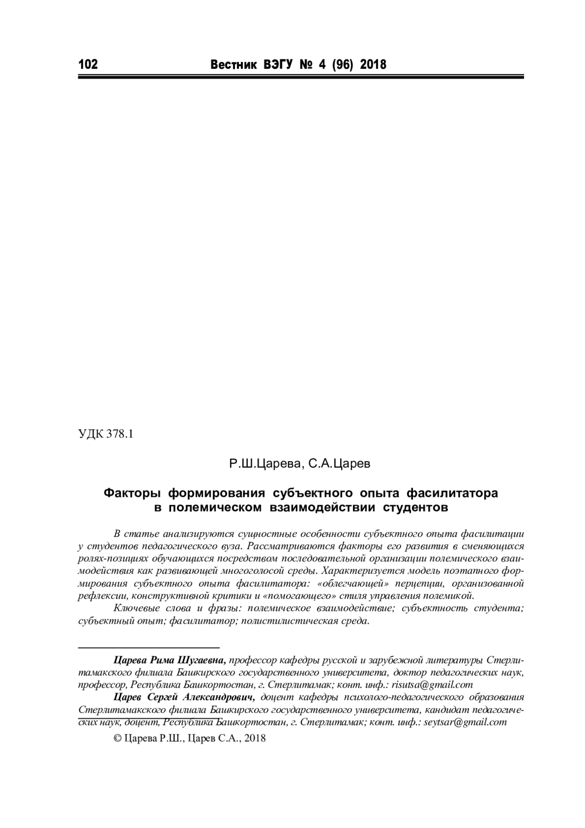 4. Царев С.А. Становление индивидуального опыта и субъектности студентов в конструктивном взаимодействии. Стерлитамак: Стерлитамакский филиал БашГУ, 2014. 183 с.