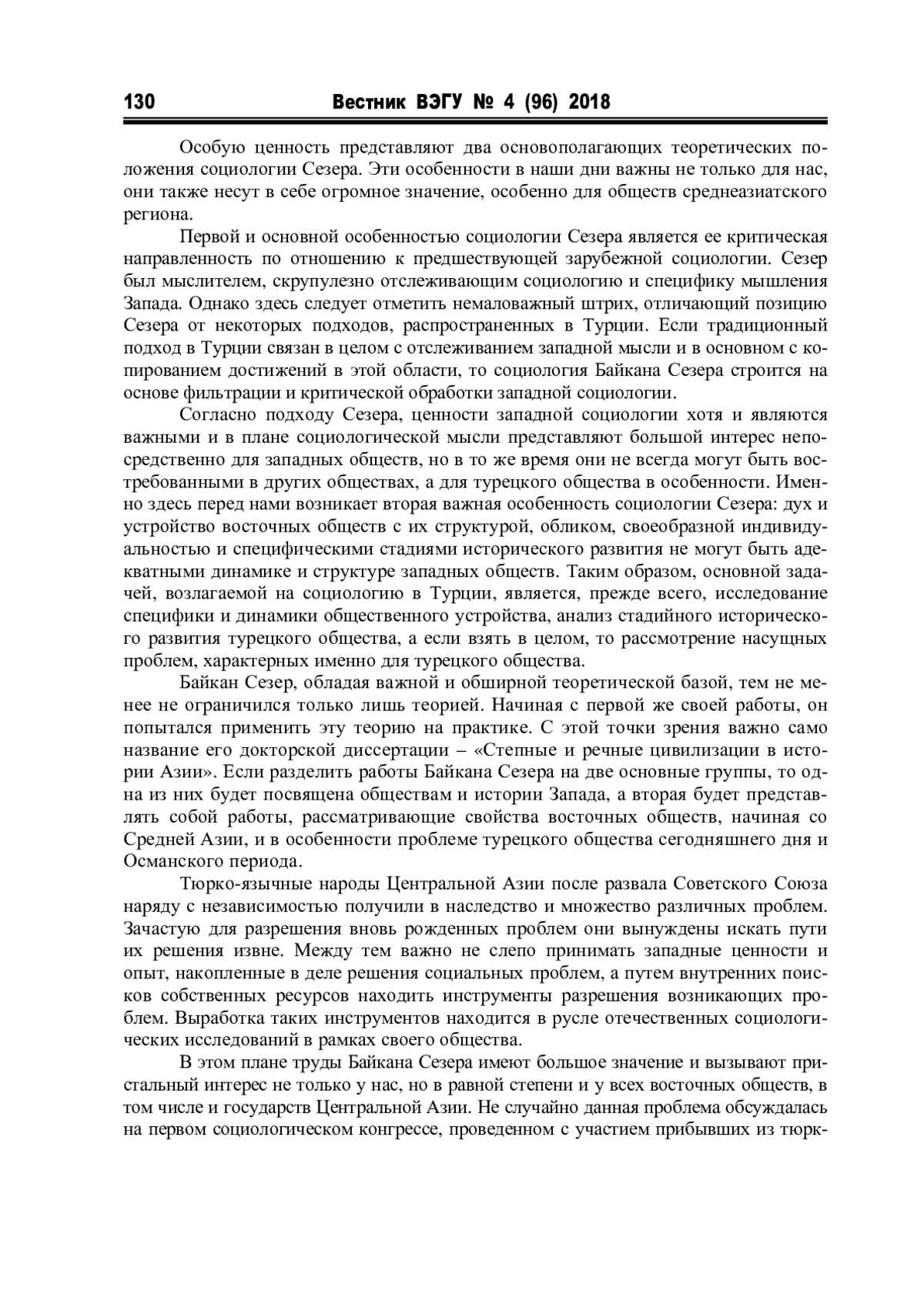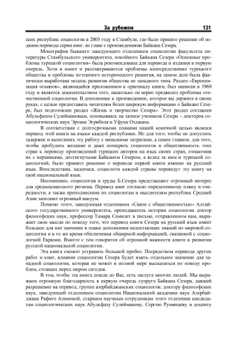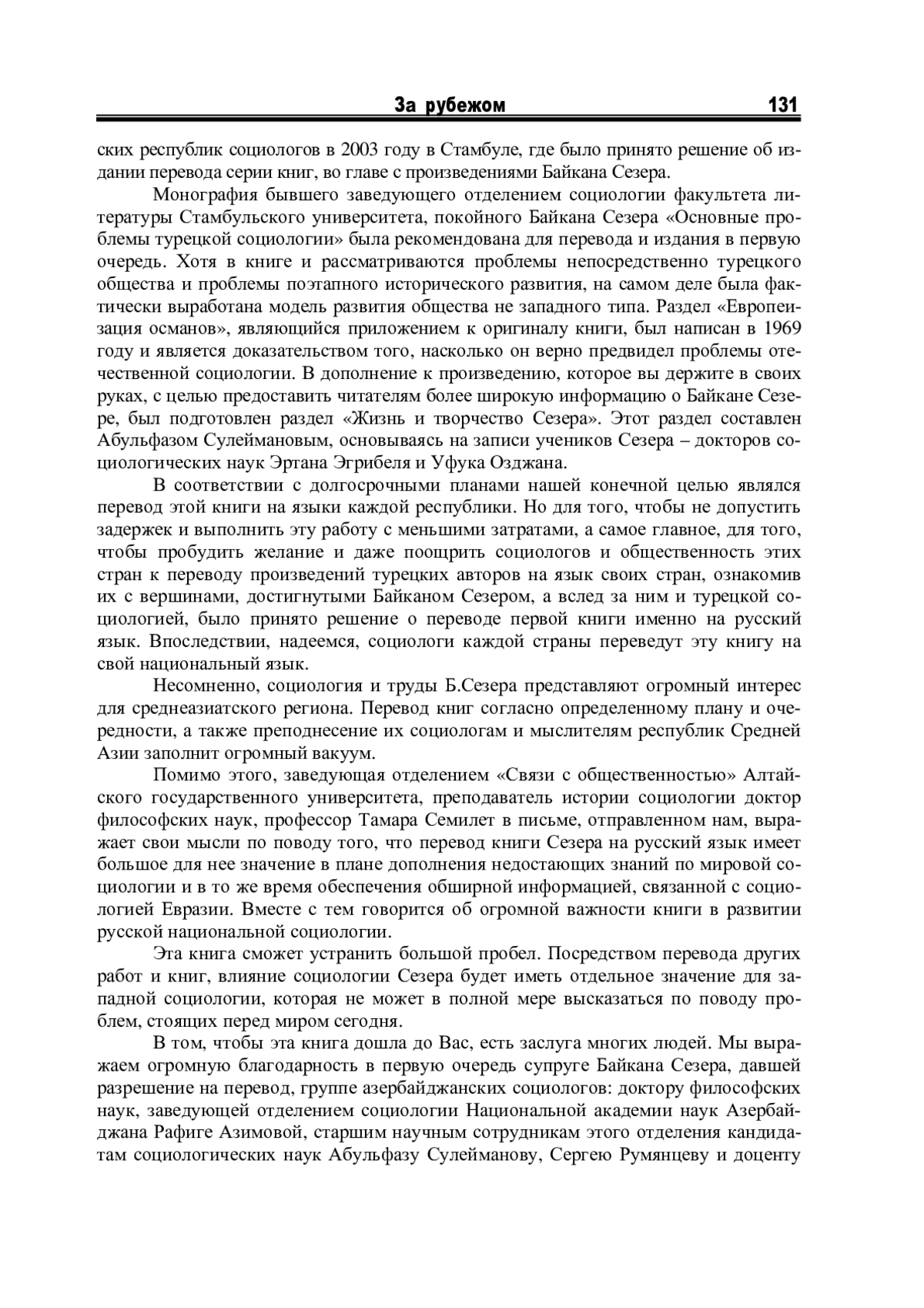 В рубрике «За рубежом» мы хотели бы познакомить вас, прежде всего социологов, с научным творчеством видного турецкого социолога Байкана Сезера (1939–2002 гг.), профессора Стамбульского университета. Окончив в 1968 году отделение социологии факультета литературы Стамбульского университета, Б. Сезер посвятил социологической науке всю свою жизнь. В 1982–93-х гг. он возглавлял кафедру общей социологии и методологии и Центр социологических исследований в этом же университете. Из-под его пера вышли в свет шесть монографий и более ста других научных публикаций