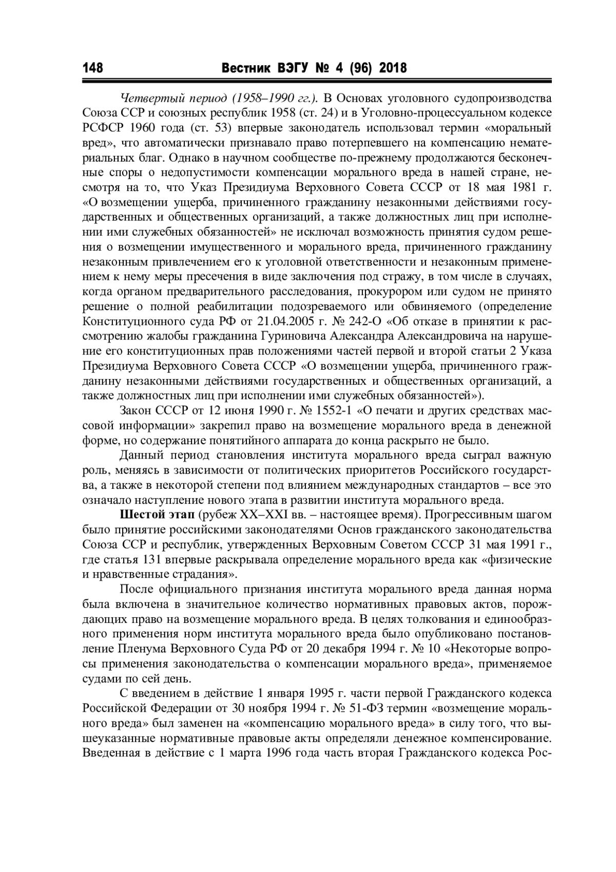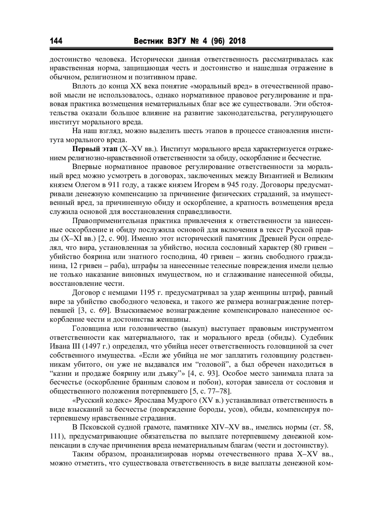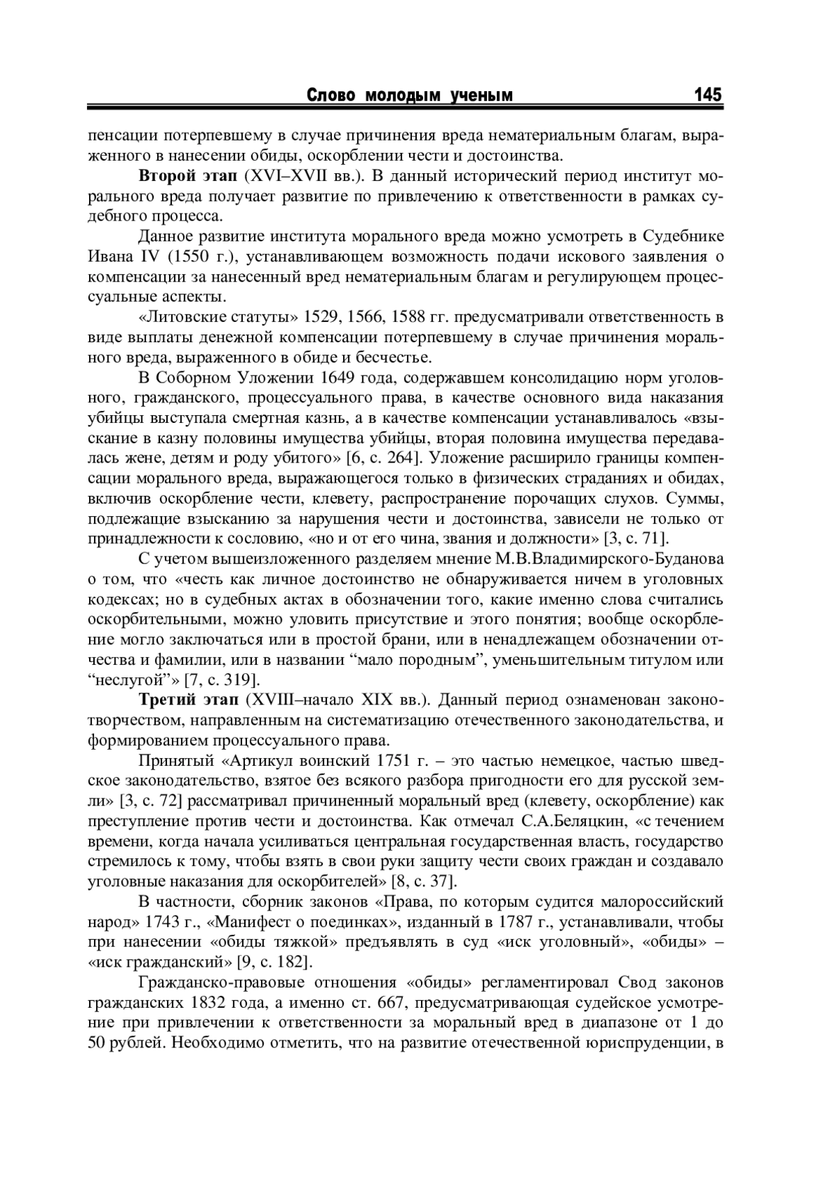 Отдельные исследования (Е. А. Михно, А. М. Эрделевский, А. Т. Табунщиков, А. В. Шичанин, С. М. Воробьев, Г. Г. Горшенко, Е. Н. Гриценко, В. С. Романов и т. д.), посвященные ответственности за причинение морального вреда, не ставили вопрос о периодизации исторического развития данного правового института, ее практической значимости для современной правовой жизни, хотя она является одной из важнейших задач историко-правовых исследований