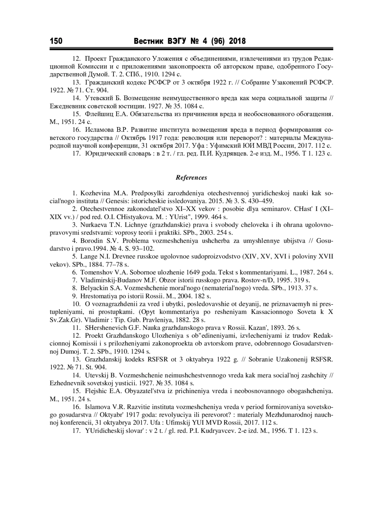 16. Исламова В.Р. Развитие института возмещения вреда в период формирования советского государства // Октябрь 1917 года: революция или переворот?: материалы Международной научной конференции, 31 октября 2017. Уфа: Уфимский ЮИ МВД России, 2017. 112 с.