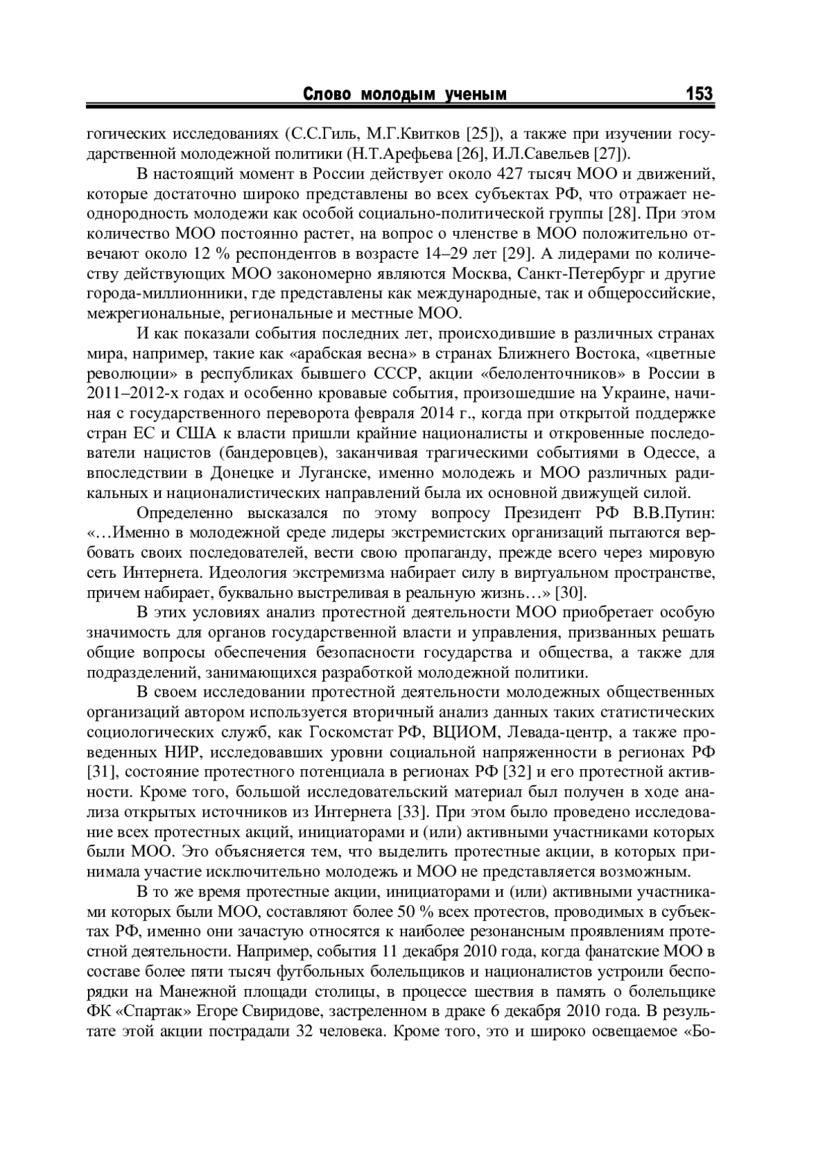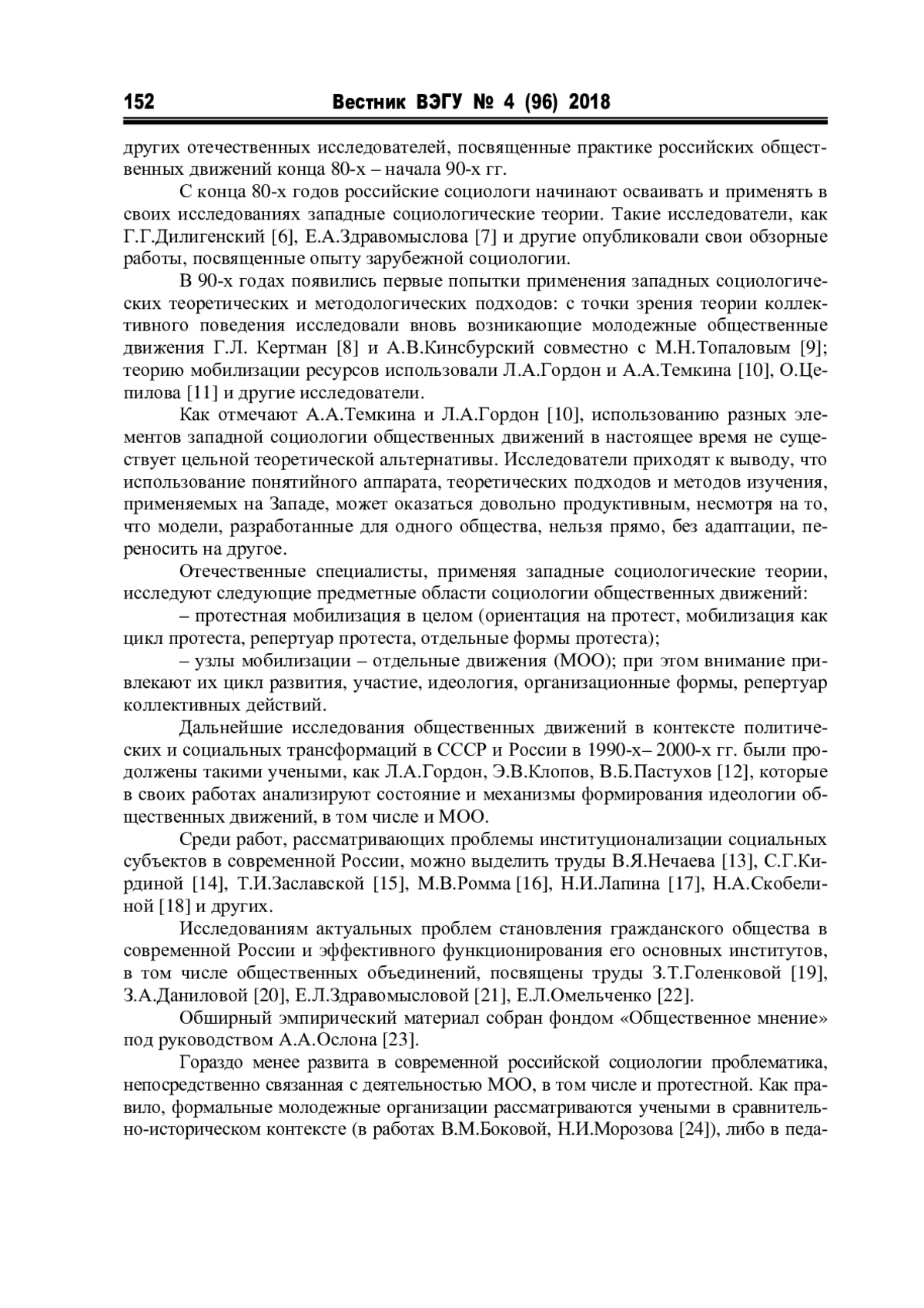 В разные исторические этапы развития социологической мысли в России исследования протестной деятельности молодежных общественных организаций (далее – МОО) по своему характеру имели особенности [1]. В конце 70-х–начале 80-х годов прошлого века в стране начались первые попытки исследования молодежных групп, таких как: дворовые спортивные команды, сообщества туристов, музыкальные самодеятельные коллективы и других. В. Т. Лисовским [2], Е. Г. Левановым [3], авторским коллективом под руководством В. И. Чупрова (Ю. А. Зубок, А. В. Кинсбурский, Л. А. Коклягина, В. В. Семенова, М. Н. Топалов) и другими исследователями также проводились различные исследования молодежных сообществ [4].