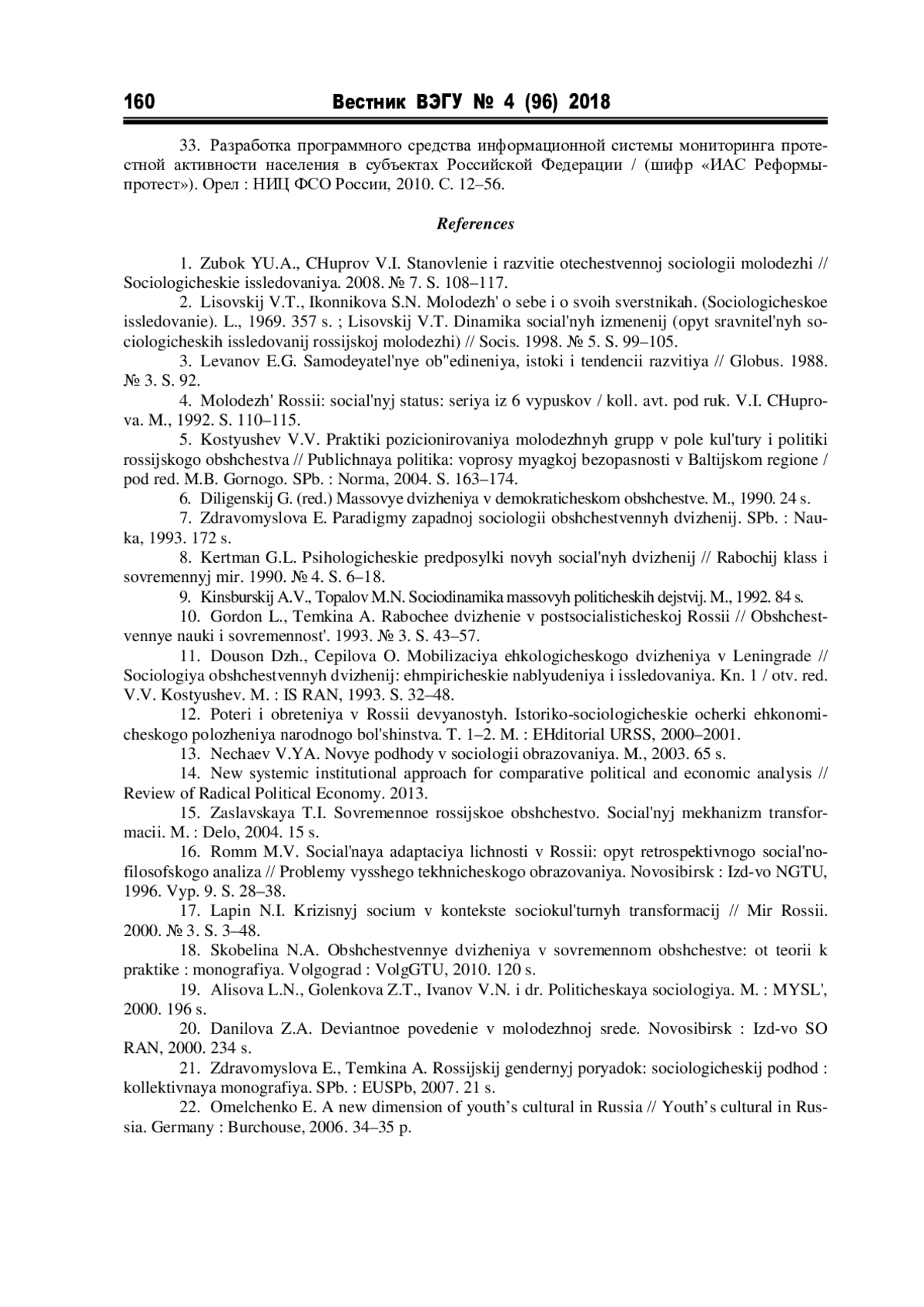 1. Зубок Ю.А., Чупров В.И. Становление и развитие отечественной социологии молодежи//Социологические исследования. 2008. № 7. С. 108-117. EDN: IRMNRH