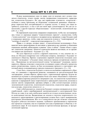 4. Волков Ю.Г. Социология будущего: подходы, поиски, проблемы//Гуманитарий Юга России. 2016. Т. 21. № 5. С. 14-30. EDN: WMMWNX