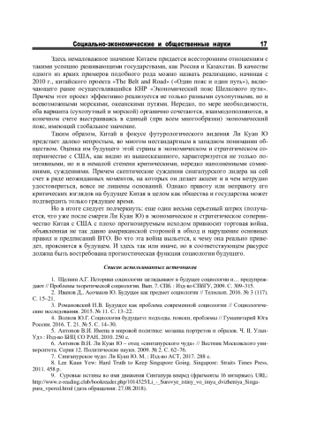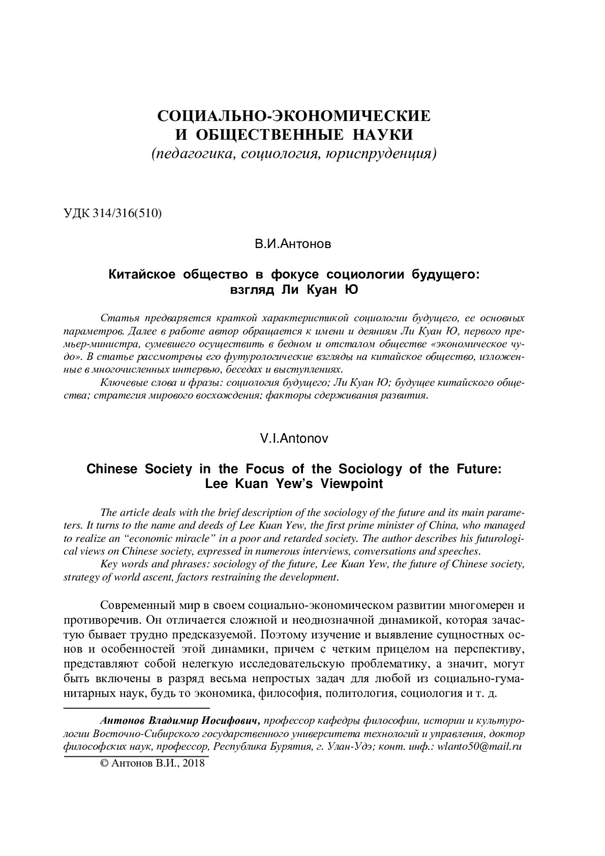 Статья предваряется краткой характеристикой социологии будущего, ее основных параметров. Далее в работе автор обращается к имени и деяниям Ли Куан Ю, первого премьер-министра, сумевшего осуществить в бедном и отсталом обществе «экономическое чудо». В статье рассмотрены его футурологические взгляды на китайское общество, изложенные в многочисленных интервью, беседах и выступлениях