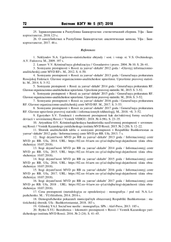 5. Состояние преступности в России за январь-декабрь 2014 года / Генеральная прокуратура РФ. Главное организационно-аналитическое управление. Управление правовой статистики. М., 2015. С. 3-52.