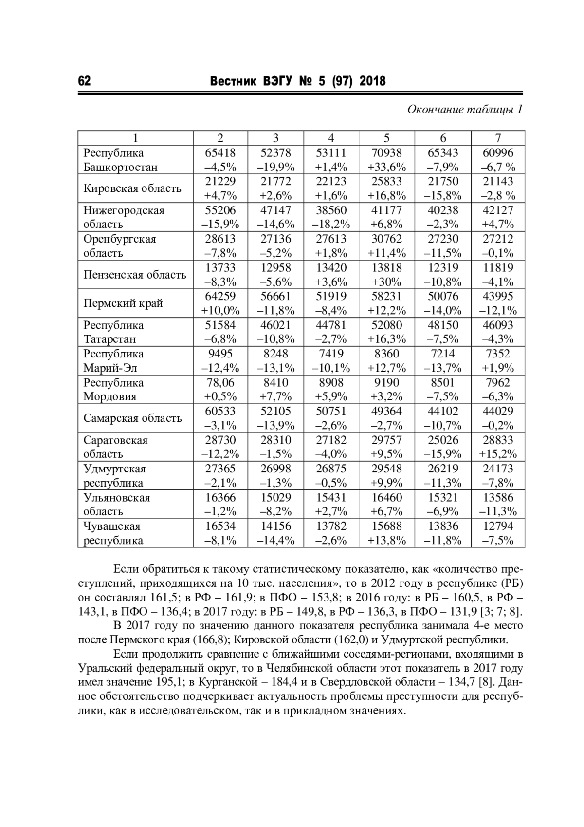 В предлагаемой статье (насколько полно это позволит ее объем) будут рассмотрены три аспекта проблемы. Во-первых, предстоит дать характеристику состоянию и тенденциям преступности в регионе в сравнении с федеральным и окружным уровнями. Во-вторых, показать деструктивное влияние преступности на социальное развитие региона. И, в-третьих, обозначить взаимообусловленность с преступностью ряда других форм деструктивной девиации