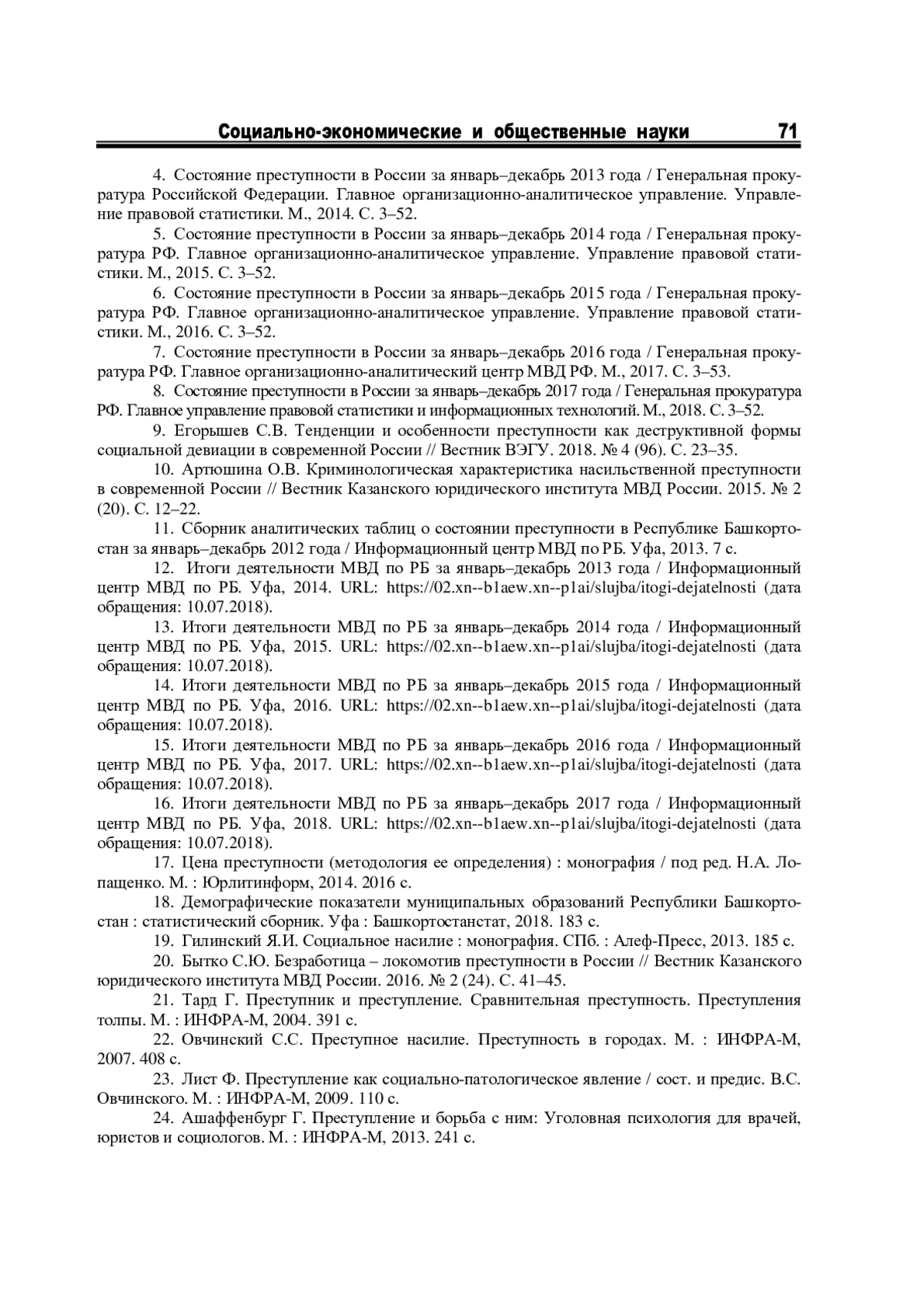 9. Егорышев С.В. Тенденции и особенности преступности как деструктивной формы социальной девиации в современной России // Вестник ВЭГУ. 2018. № 4 (96). С. 23-35. EDN: XWCBNZ