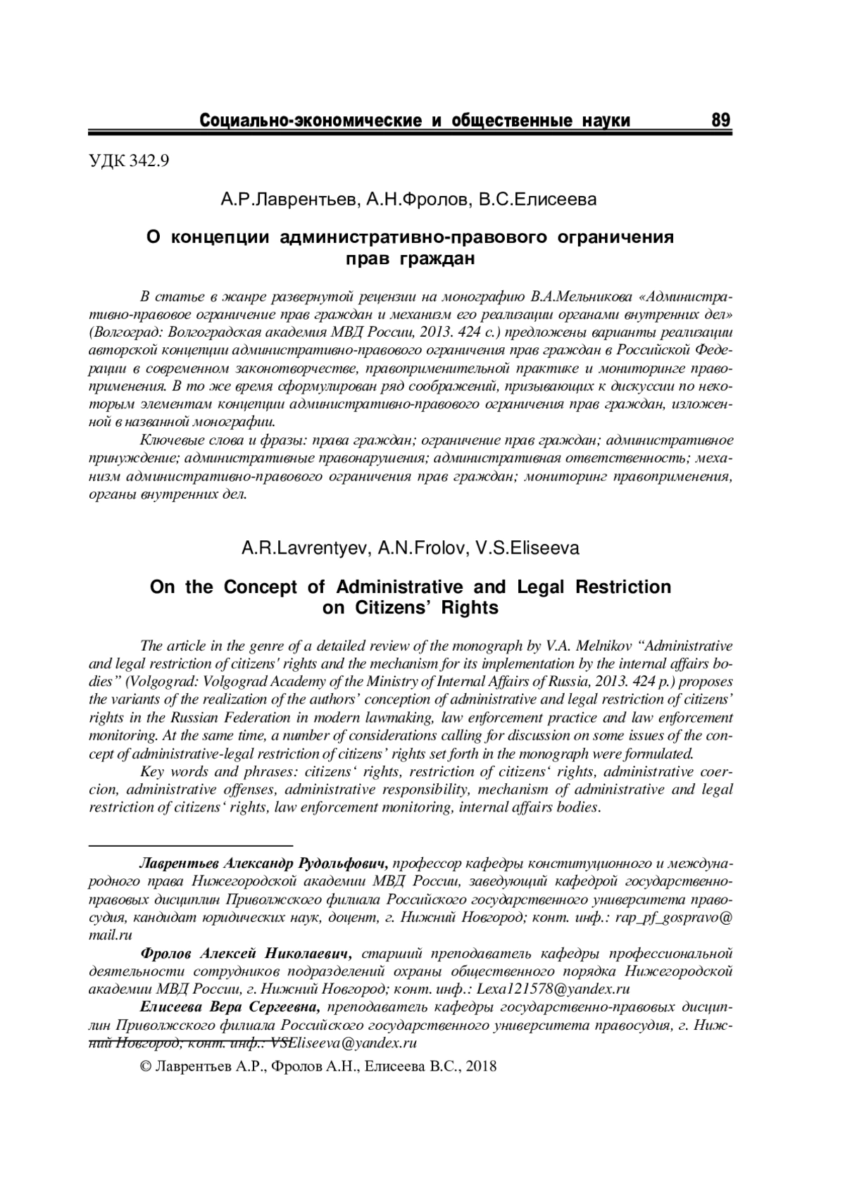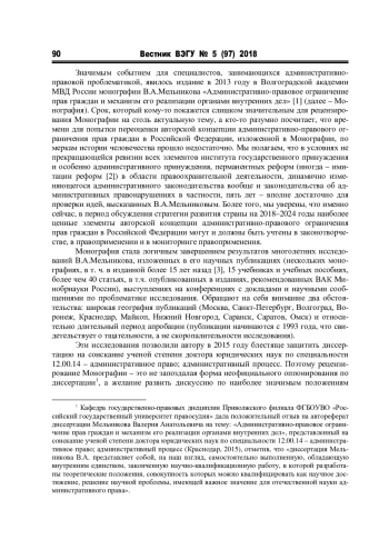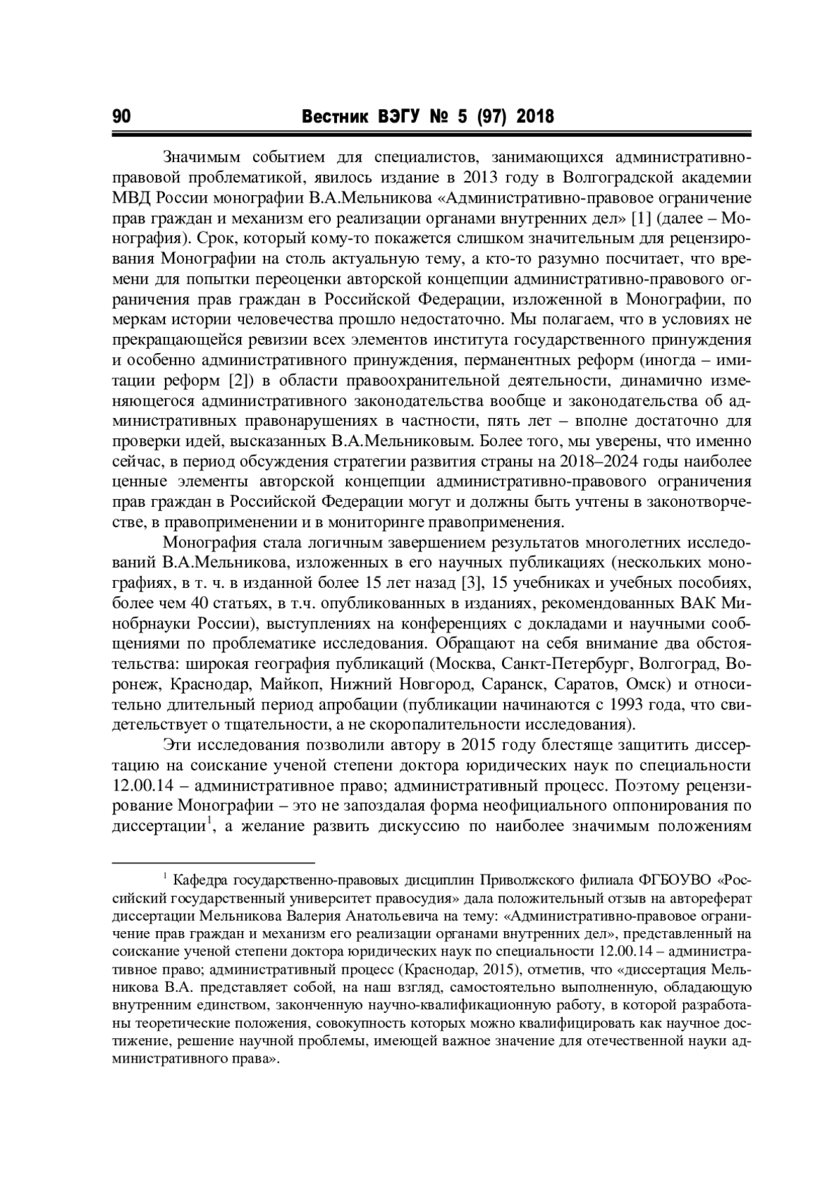 Значимым событием для специалистов, занимающихся административноправовой проблематикой, явилось издание в 2013 году в Волгоградской академии МВД России монографии В. А. Мельникова «Административно-правовое ограничение прав граждан и механизм его реализации органами внутренних дел» [1] (далее – Монография). Срок, который кому-то покажется слишком значительным для рецензирования Монографии на столь актуальную тему, а кто-то разумно посчитает, что времени для попытки переоценки авторской концепции административно-правового ограничения прав граждан в Российской Федерации, изложенной в Монографии, по меркам истории человечества прошло недостаточно. Мы полагаем, что в условиях не прекращающейся ревизии всех элементов института государственного принуждения и особенно административного принуждения, перманентных реформ (иногда – имитации реформ [2]) в области правоохранительной деятельности, динамично изменяющегося административного законодательства вообще и законодательства об административных правонарушениях в частности, пять лет – вполне достаточно для проверки идей, высказанных В. А. Мельниковым. Более того, мы уверены, что именно сейчас, в период обсуждения стратегии развития страны на 2018–2024 годы наиболее ценные элементы авторской концепции административно-правового ограничения прав граждан в Российской Федерации могут и должны быть учтены в законотворчестве, в правоприменении и в мониторинге правоприменения