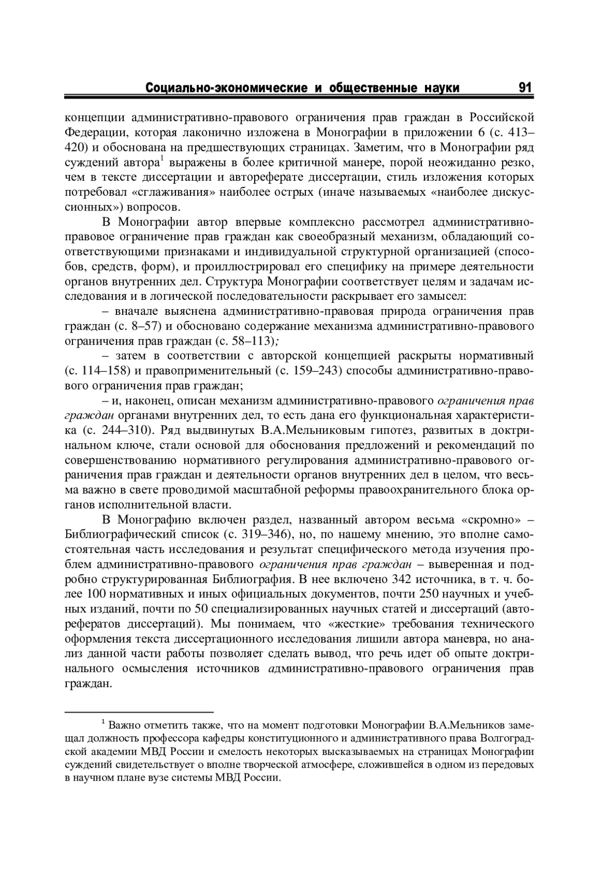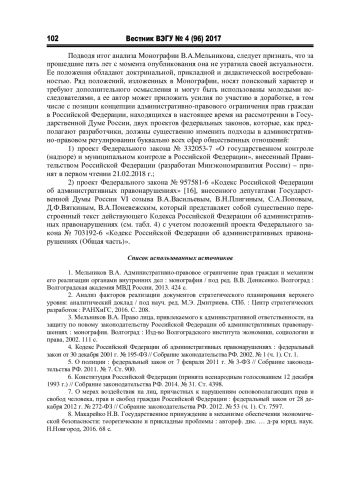 1. Мельников В.А. Административно-правовое ограничение прав граждан и механизм его реализации органами внутренних дел: монография / под ред. В.В. Денисенко. Волгоград: Волгоградская академия МВД России, 2013. 424 с. EDN: SARBSZ