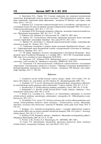 6. Заводчиков Н.Д., Ларина Т.Н. Сельская территория как социально-экономическая подсистема, формирующая качество жизни населения // Институциональное развитие: экономика, управление, социальная сфера образование: материалы IV Междун. науч.-практ. конф. Омск, 2014. С. 216-221. EDN: SZQIOD