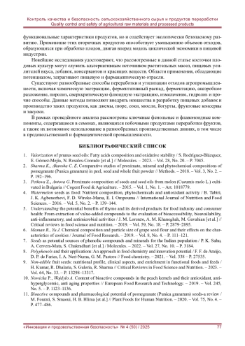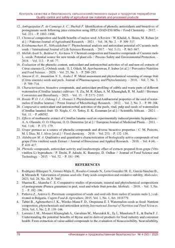 12. Ambigaipalan P., de Camargo A. C., Shahidi F. Identification of phenolic antioxidants and bioactives of pomegranate seeds following juice extraction using HPLC-DAD-ESI-MSn // Food Chemistry. - 2017. - Vol. 221. - P. 1883-1894.