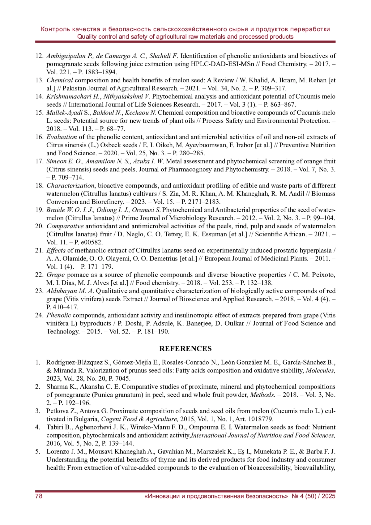 3. Petkova Z., Antova G. Proximate composition of seeds and seed oils from melon (Cucumis melo L.) cultivated in Bulgaria // Cogent Food & Agriculture. - 2015. - Vol. 1, No. 1. - Art. 1018779. EDN: WABBHP