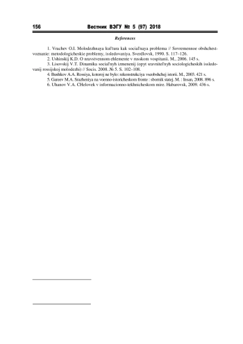 3. Лисовский В.Т. Динамика социальных изменений (опыт сравнительных социологических исследований российской молодежи) // Социс. 2008. № 5. С. 102-108.