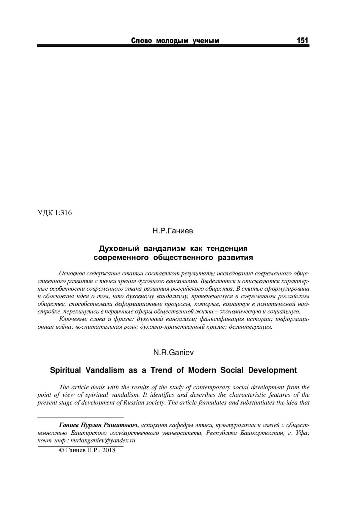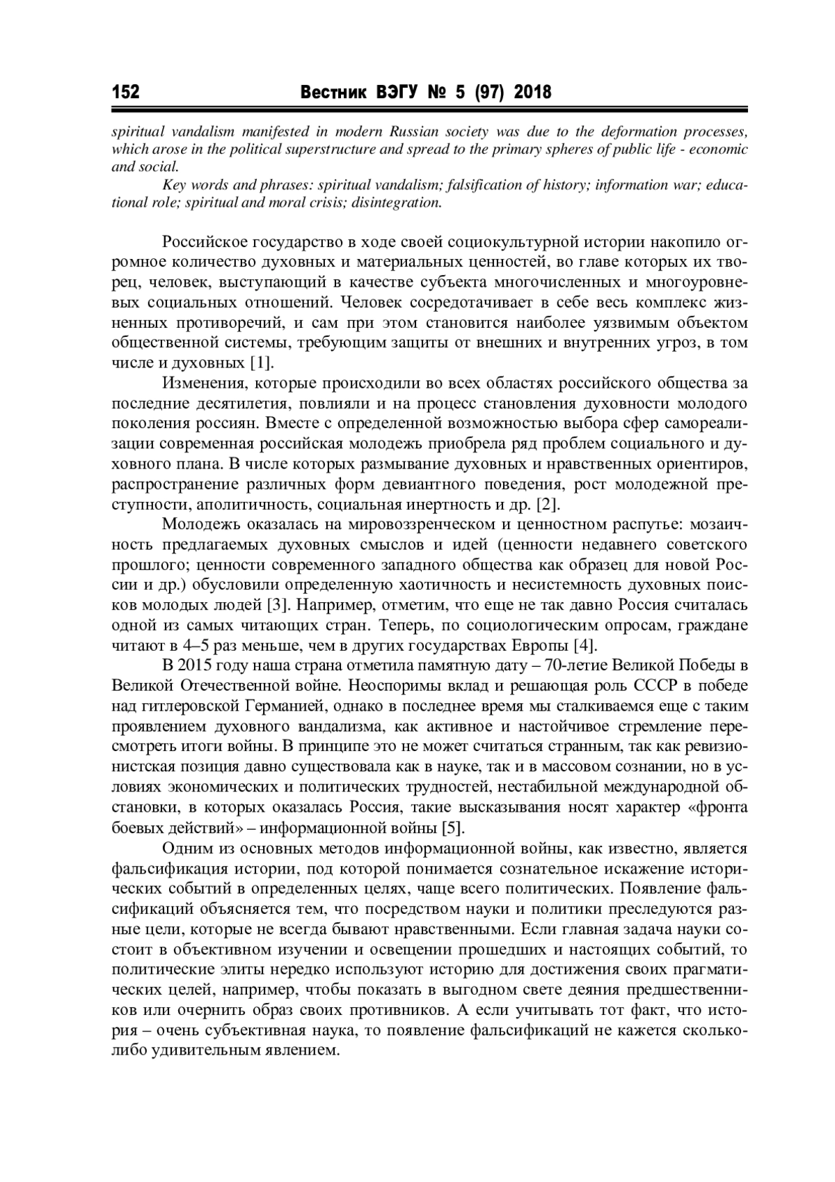Основное содержание статьи составляют результаты исследования современного общественного развития с точки зрения духовного вандализма. Выделяются и описываются характерные особенности современного этапа развития российского общества. В статье сформулирована и обоснована идея о том, что духовному вандализму, проявившемуся в современном российском обществе, способствовали деформационные процессы, которые, возникнув в политической надстройке, перекинулись в первичные сферы общественной жизни – экономическую и социальную.