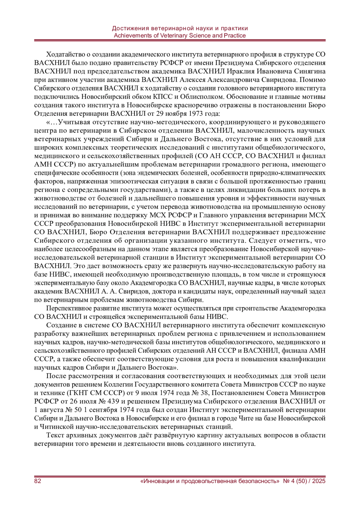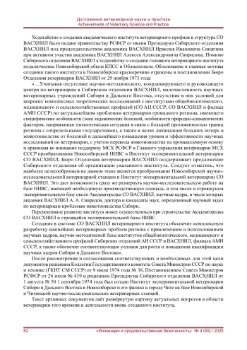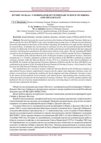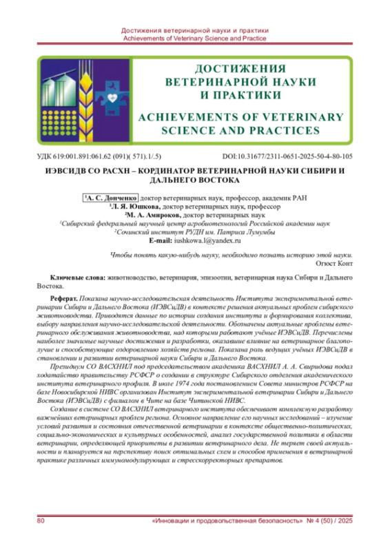 Показана научно-исследовательская деятельность Института экспериментальной ветеринарии Сибири и Дальнего Востока (ИЭВСиДВ) в контексте решения актуальных проблем сибирского животноводства. Приводятся данные по истории создания института и формирования коллектива, выбору направления научно-исследовательской деятельности. Обозначены актуальные проблемы ветеринарного обслуживания животноводства, над которыми работают учёные ИЭВСиДВ. Перечислены наиболее значимые научные достижения и разработки, оказавшие влияние на ветеринарное благополучие и способствующие оздоровлению хозяйств региона. Показана роль ведущих учёных ИЭВСиДВ в становлении и развитии ветеринарной науки Сибири и Дальнего Востока. Президиум СО ВАСХНИЛ под председательством академика ВАСХНИЛ А. А. Свиридова подал ходатайство правительству РСФСР о создании в структуре Сибирского отделения академического института ветеринарного профиля. В июле 1974 года постановлением Совета министров РСФСР на базе Новосибирской НИВС организован Институт экспериментальной ветеринарии Сибири и Дальнего Востока (ИЭВСиДВ) с филиалом в Чите на базе Читинской НИВС. Создание в системе СО ВАСХНИЛ ветеринарного института обеспечивает комплексную разработку важнейших ветеринарных проблем региона. Основное направление его научных исследований - изучение условий развития и состояния отечественной ветеринарии в контексте общественно-политических, социально-экономических и культурных особенностей, анализ государственной политики в области ветеринарии, определяющей приоритеты в развитии ветеринарного дела. Не теряет своей актуальности и планируется на перспективу поиск оптимальных схем и способов применения в ветеринарной практике различных иммуномодулирующих и стресскорректорных препаратов.