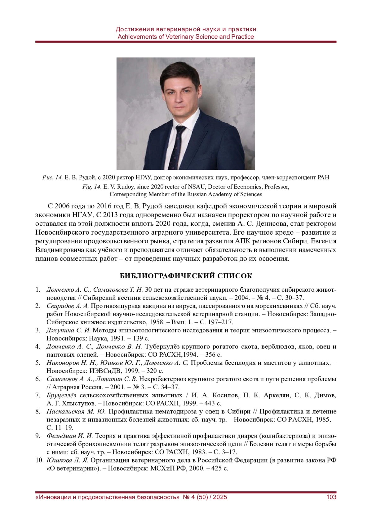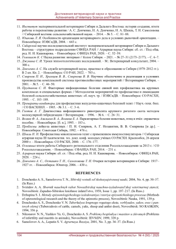 1. Донченко А. С., Самоловова Т. Н. 30 лет на страже ветеринарного благополучия сибирского животноводства // Сибирский вестник сельскохозяйственной науки. - 2004. - № 4. - С. 30-37. EDN: PJRZML