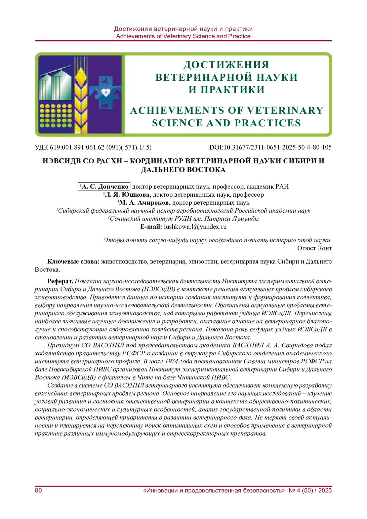 11. Институт экспериментальной ветеринарии Сибири и Дальнего Востока: история создания, итоги работы и перспективы развития / А. С. Донченко, Н. А. Донченко, Н. А. Шкиль, Т. Н. Самоловова // Сибирский вестник сельскохозяйственной науки. - 2014. - № 5. - С. 81-88. EDN: SZSEWH
