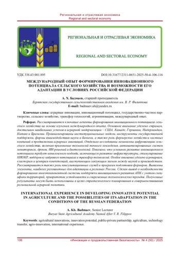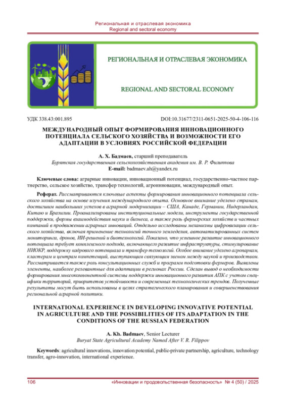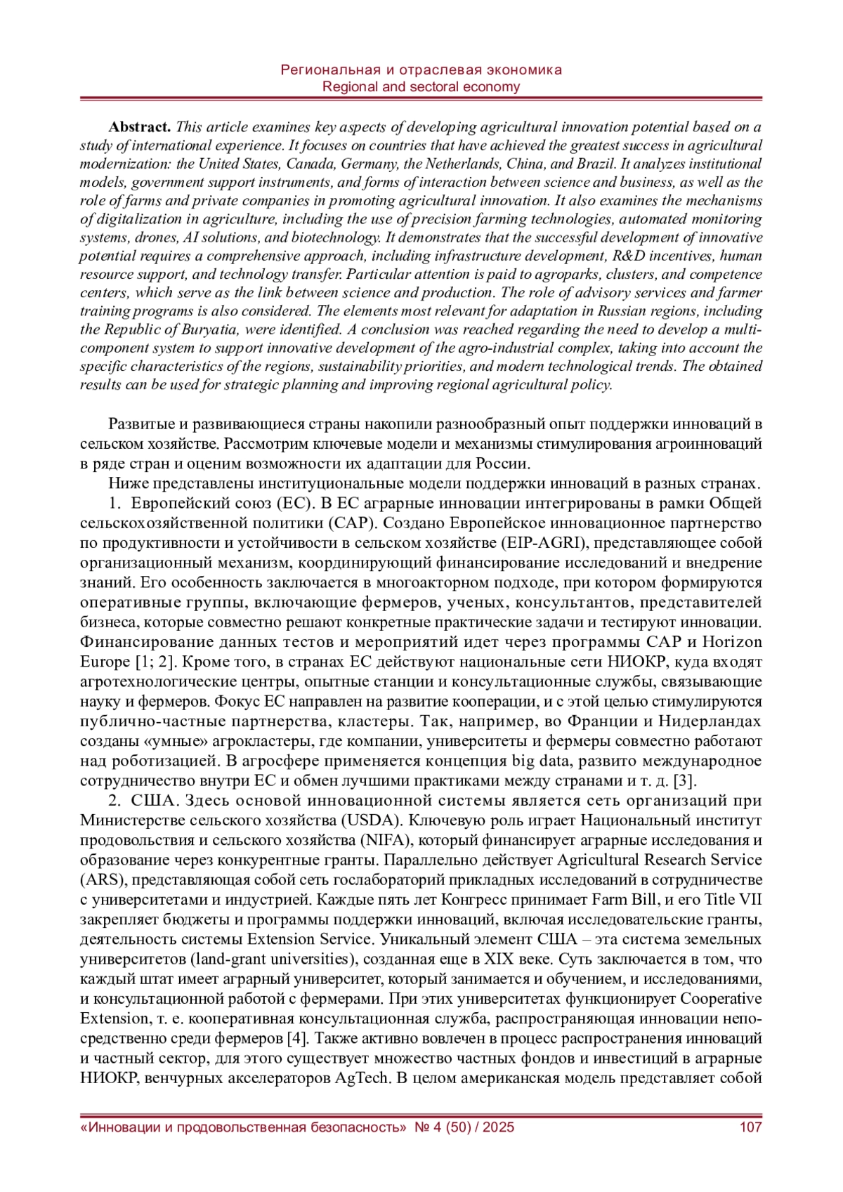 Рассматриваются ключевые аспекты формирования инновационного потенциала сельского хозяйства на основе изучения международного опыта. Основное внимание уделено странам, достигшим наибольших успехов в аграрной модернизации - США, Канаде, Германии, Нидерландам, Китаю и Бразилии. Проанализированы институциональные модели, инструменты государственной поддержки, формы взаимодействия науки и бизнеса, а также роль фермерских хозяйств и частных компаний в продвижении аграрных инноваций. Отдельно исследованы механизмы цифровизации сельского хозяйства, включая применение технологий точного земледелия, автоматизированных систем мониторинга, дронов, ИИ-решений и биотехнологий. Показано, что успешное развитие инновационного потенциала требует комплексного подхода, включающего развитие инфраструктуры, стимулирование НИОКР, поддержку кадрового потенциала и трансфер технологий. Особое внимание уделено агропаркам, кластерам и центрам компетенций, выступающим связующим звеном между наукой и производством. Рассматривается также роль консультационных служб и программ подготовки фермеров. Выявлены элементы, наиболее релевантные для адаптации в регионах России, включая Республику Бурятия. Сделан вывод о необходимости формирования многокомпонентной системы поддержки инновационного развития АПК с учетом специфики территорий, приоритетов устойчивости и современных технологических трендов. Полученные результаты могут быть использованы в целях стратегического планирования и совершенствования региональной аграрной политики.