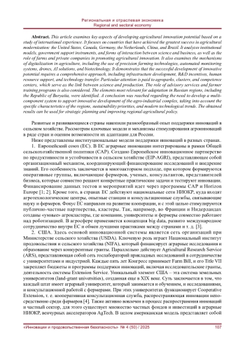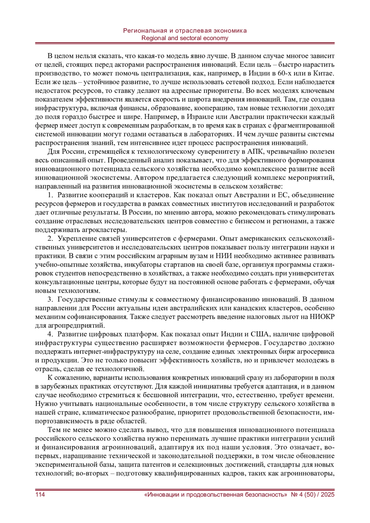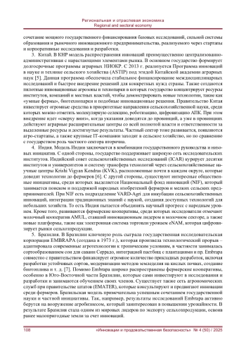 Европейский союз (ЕС). В ЕС аграрные инновации интегрированы в рамки Общей сельскохозяйственной политики (CAP). Создано Европейское инновационное партнерство по продуктивности и устойчивости в сельском хозяйстве (EIP‑AGRI), представляющее собой организационный механизм, координирующий финансирование исследований и внедрение знаний. Его особенность заключается в многоакторном подходе, при котором формируются оперативные группы, включающие фермеров, ученых, консультантов, представителей бизнеса, которые совместно решают конкретные практические задачи и тестируют инновации. Финансирование данных тестов и мероприятий идет через программы CAP и Horizon Europe [1; 2]. Кроме того, в странах ЕС действуют национальные сети НИОКР, куда входят агротехнологические центры, опытные станции и консультационные службы, связывающие науку и фермеров. Фокус ЕС направлен на развитие кооперации, и с этой целью стимулируются публично‑частные партнерства, кластеры. Так, например, во Франции и Нидерландах созданы «умные» агрокластеры, где компании, университеты и фермеры совместно работают над роботизацией. В агросфере применяется концепция big data, развито международное сотрудничество внутри ЕС и обмен лучшими практиками между странами и т. д. [3].
