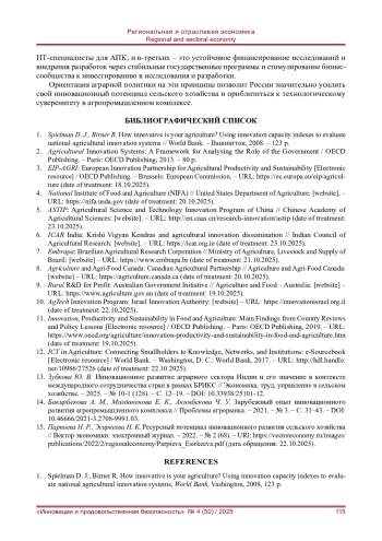 1. Spielman D. J., Birner R. How innovative is your agriculture? Using innovation capacity indexes to evaluate national agricultural innovation systems // World Bank. - Вашингтон, 2008. - 123 p.
