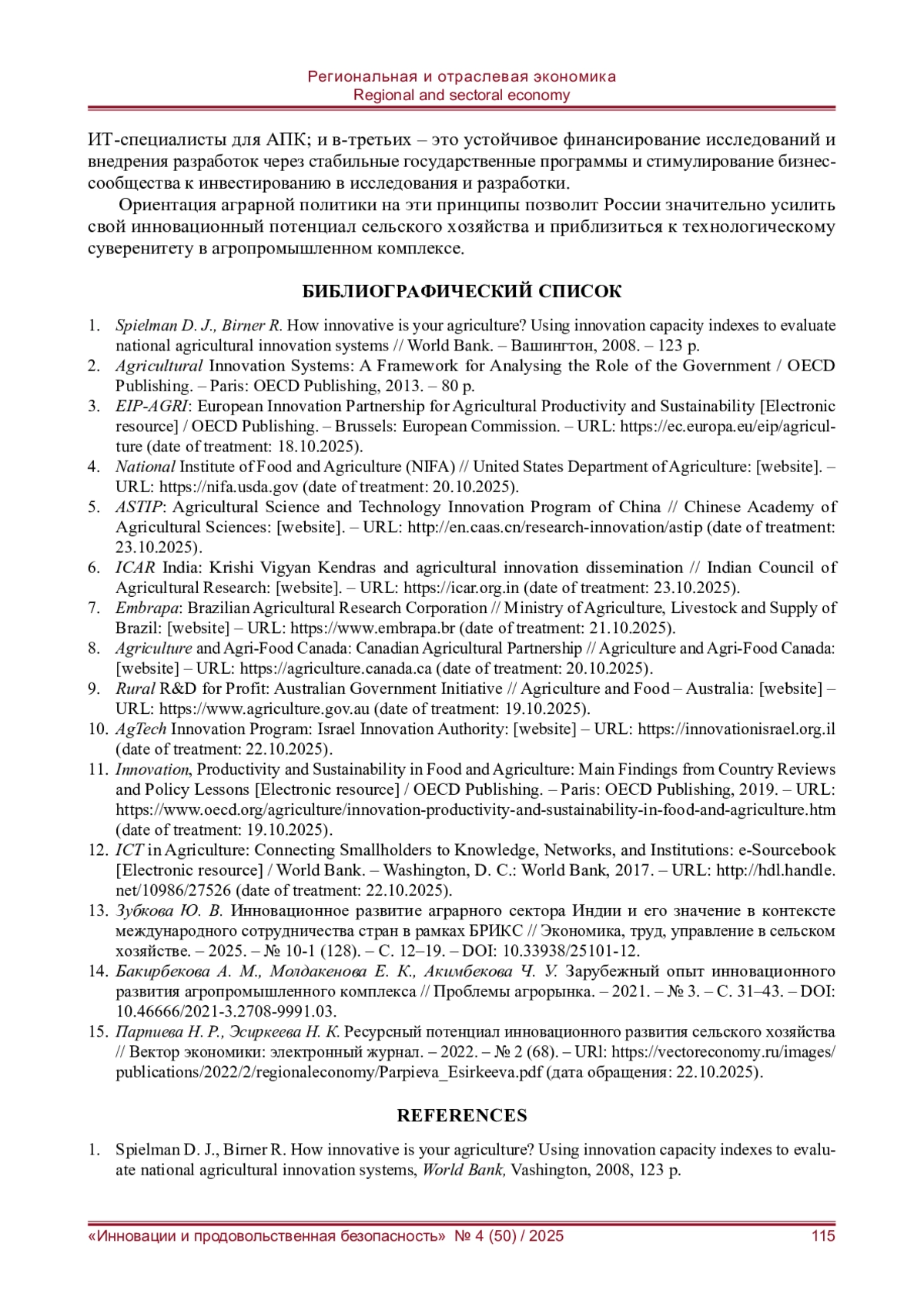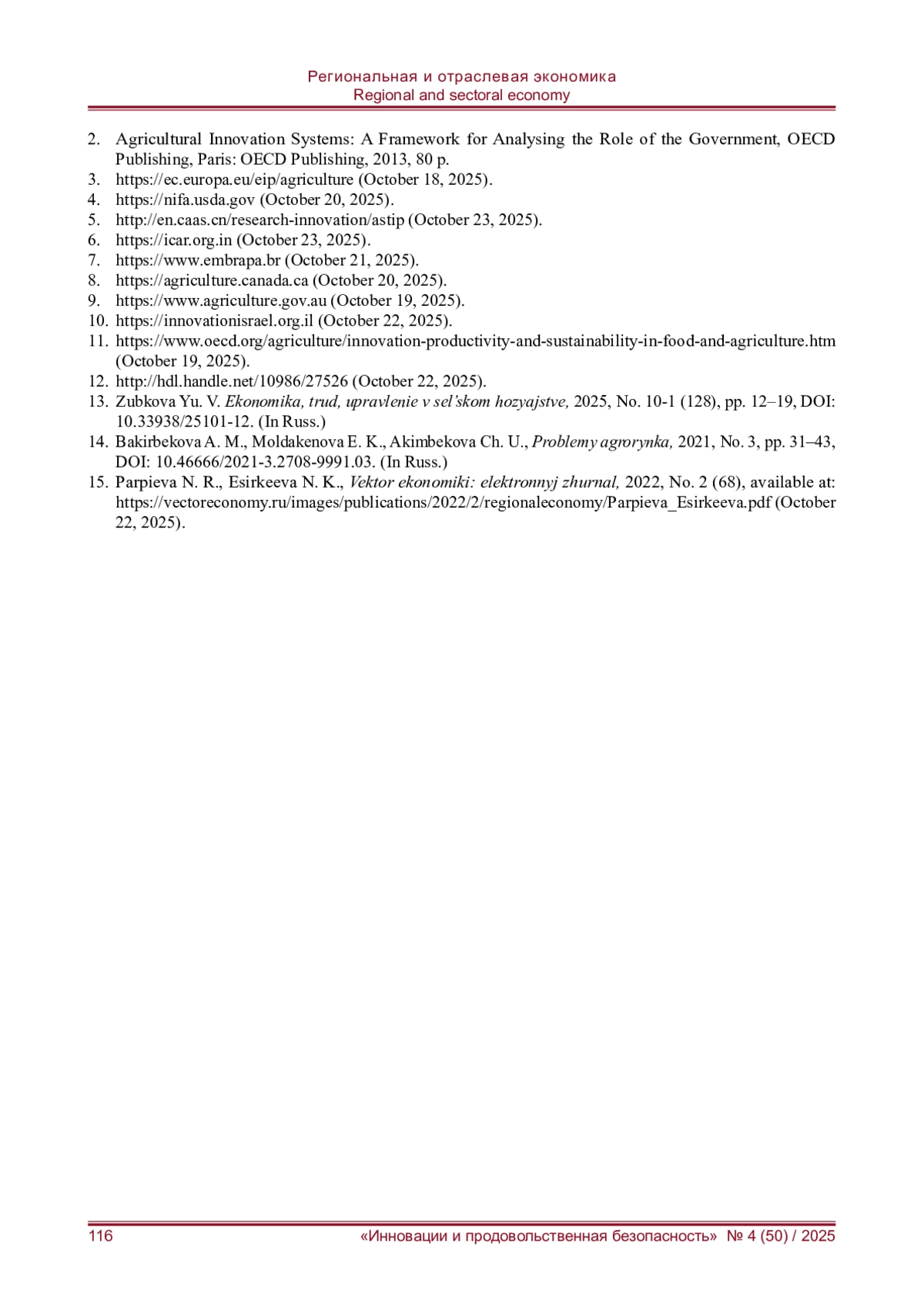 15. Парпиева Н. Р., Эсиркеева Н. К. Ресурсный потенциал инновационного развития сельского хозяйства // Вектор экономики: электронный журнал. - 2022. - № 2 (68). - URl: https://vectoreconomy.ru/images/publications/2022/2/regionaleconomy/Parpieva_Esirkeeva.pdf (дата обращения: 22.10.2025).