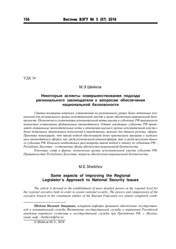 Статья посвящена вопросам установления на региональном уровне более детальных полномочий для регионального органа исполнительной власти в целях обеспечения национальной безопасности. Полномочия и компетенции исполнительной ветви власти в субъектах РФ практически полностью установлены федеральным законодателем. Однако некоторые субъекты РФ принимают специальные законодательные акты в отношении высшего органа исполнительной власти с более детальным закреплением полномочий в определенных, важных для данного региона, сферах. Практика показывает, что такой подход обеспечивает более пристальное внимание к выделенным законодателем сферам, как среди региональной администрации, так и среди населения данного субъекта РФ. Полагаем необходимым рассмотреть такой подход к одному из субъектов РФ – Республике Дагестан – в отношении сферы обеспечения национальной безопасности