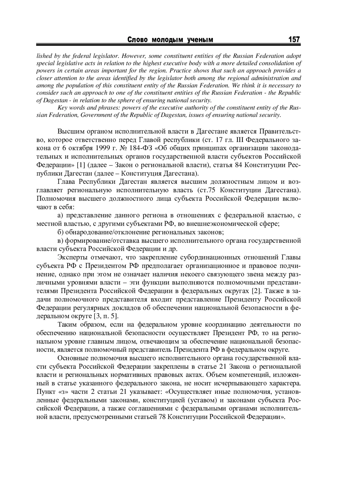 Высшим органом исполнительной власти в Дагестане является Правительство, которое ответственно перед Главой республики (ст. 17 гл. III Федерального закона от 6 октября 1999 г. No 184-ФЗ «Об общих принципах организации законодательных и исполнительных органов государственной власти субъектов Российской Федерации» [1] (далее – Закон о региональной власти), статья 84 Конституции Республики Дагестан (далее – Конституция Дагестана).