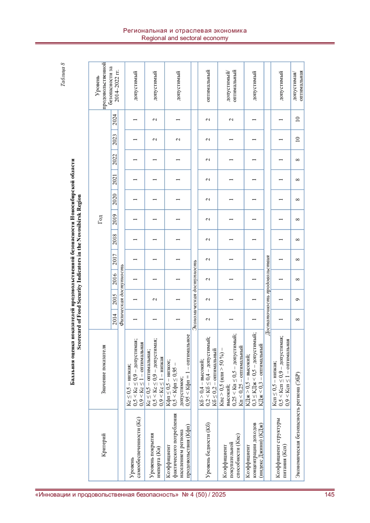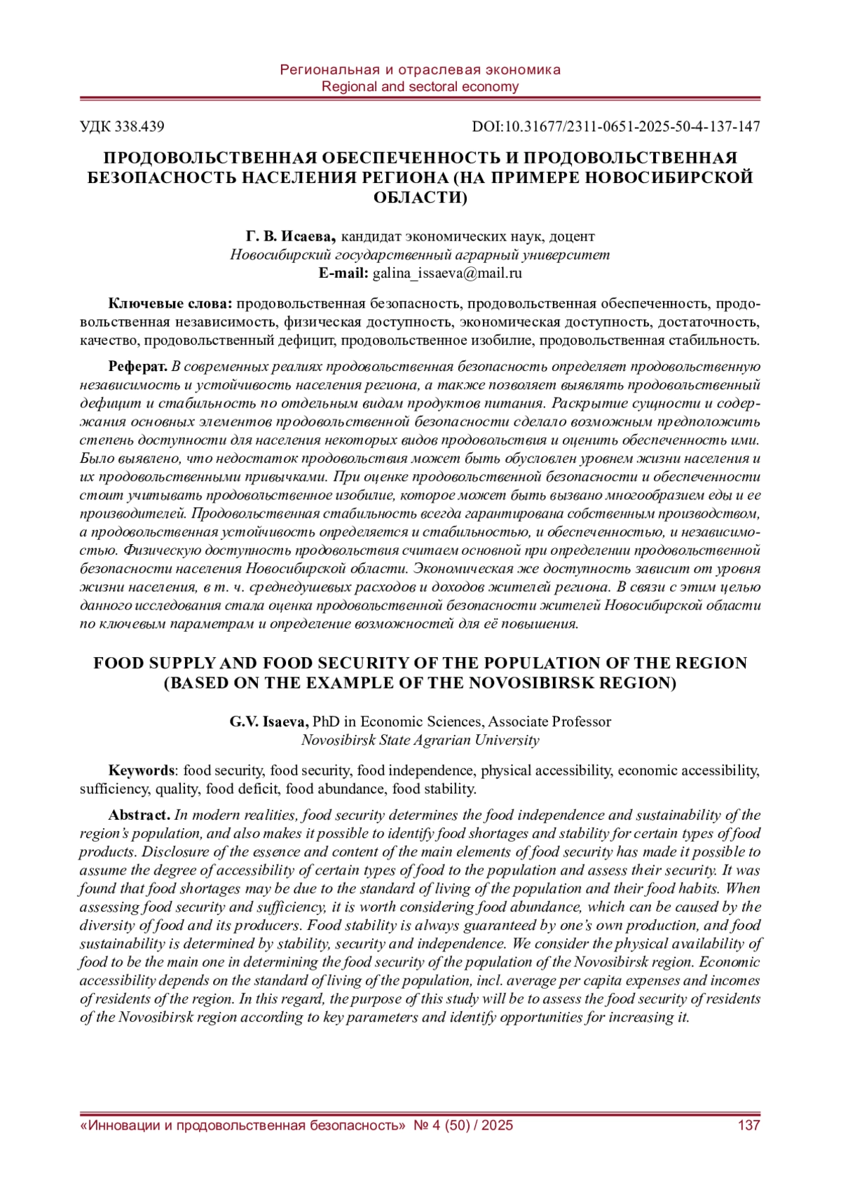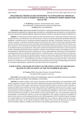 В современных реалиях продовольственная безопасность определяет продовольственную независимость и устойчивость населения региона, а также позволяет выявлять продовольственный дефицит и стабильность по отдельным видам продуктов питания. Раскрытие сущности и содержания основных элементов продовольственной безопасности сделало возможным предположить степень доступности для населения некоторых видов продовольствия и оценить обеспеченность ими. Было выявлено, что недостаток продовольствия может быть обусловлен уровнем жизни населения и их продовольственными привычками. При оценке продовольственной безопасности и обеспеченности стоит учитывать продовольственное изобилие, которое может быть вызвано многообразием еды и ее производителей. Продовольственная стабильность всегда гарантирована собственным производством, а продовольственная устойчивость определяется и стабильностью, и обеспеченностью, и независимостью. Физическую доступность продовольствия считаем основной при определении продовольственной безопасности населения Новосибирской области. Экономическая же доступность зависит от уровня жизни населения, в т. ч. среднедушевых расходов и доходов жителей региона. В связи с этим целью данного исследования стала оценка продовольственной безопасности жителей Новосибирской области по ключевым параметрам и определение возможностей для её повышения.