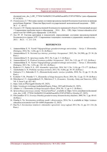 15. Оловянников Д. Г. Методика оценки состояния продовольственной безопасности региона на примере республики Бурятия // Известия Иркутской государственной экономической академии. - 2009. - № 3. - С. 60-63.