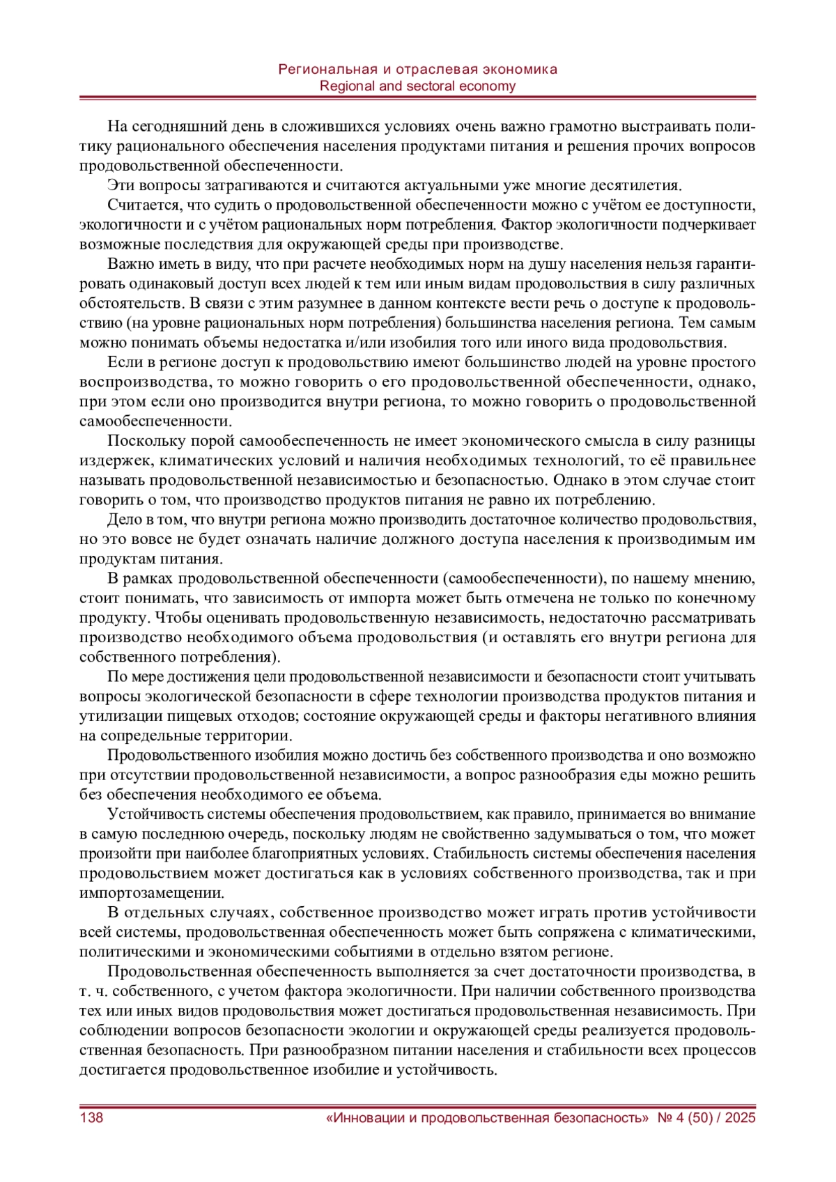 В рамках продовольственной обеспеченности (самообеспеченности), по нашему мнению, стоит понимать, что зависимость от импорта может быть отмечена не только по конечному продукту. Чтобы оценивать продовольственную независимость, недостаточно рассматривать производство необходимого объема продовольствия (и оставлять его внутри региона для собственного потребления). По мере достижения цели продовольственной независимости и безопасности стоит учитывать вопросы экологической безопасности в сфере технологии производства продуктов питания и утилизации пищевых отходов; состояние окружающей среды и факторы негативного влияния на сопредельные территории.