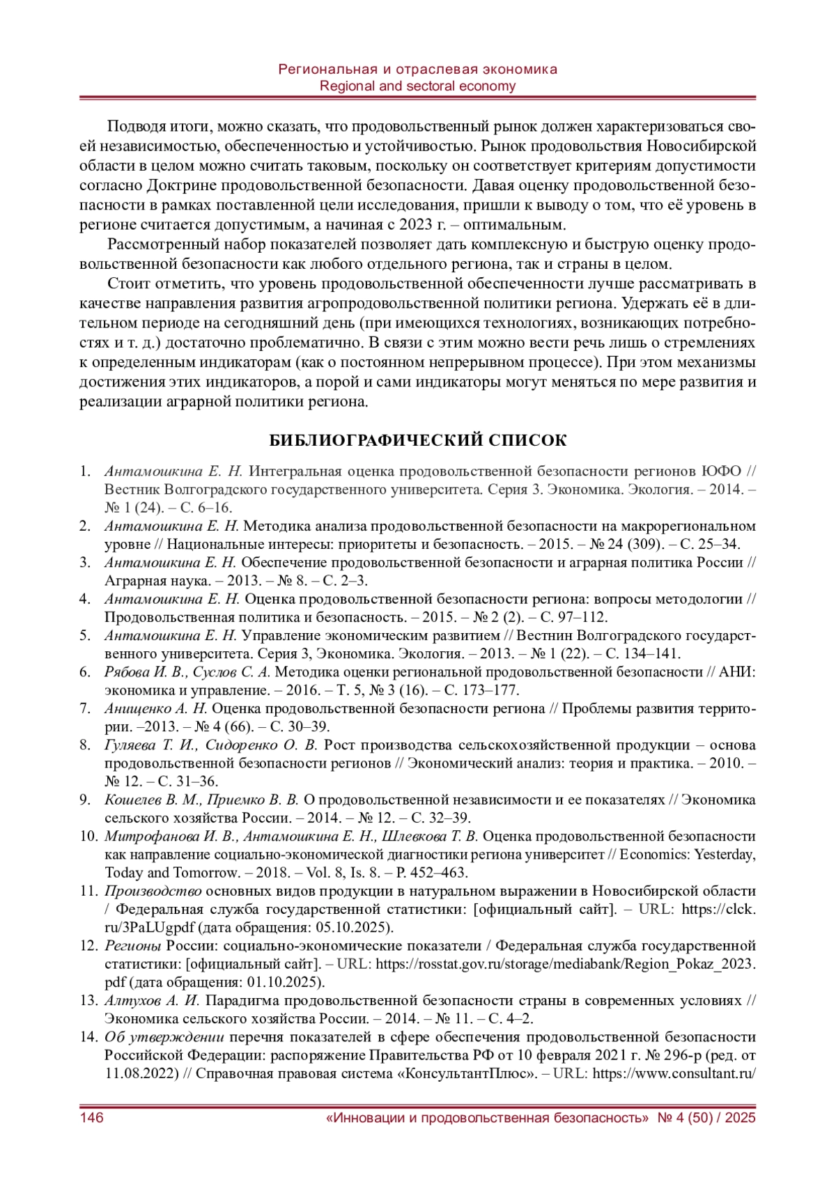 4. Антамошкина Е. Н. Оценка продовольственной безопасности региона: вопросы методологии // Продовольственная политика и безопасность. - 2015. - № 2 (2). - С. 97-112. EDN: VCUIBR
