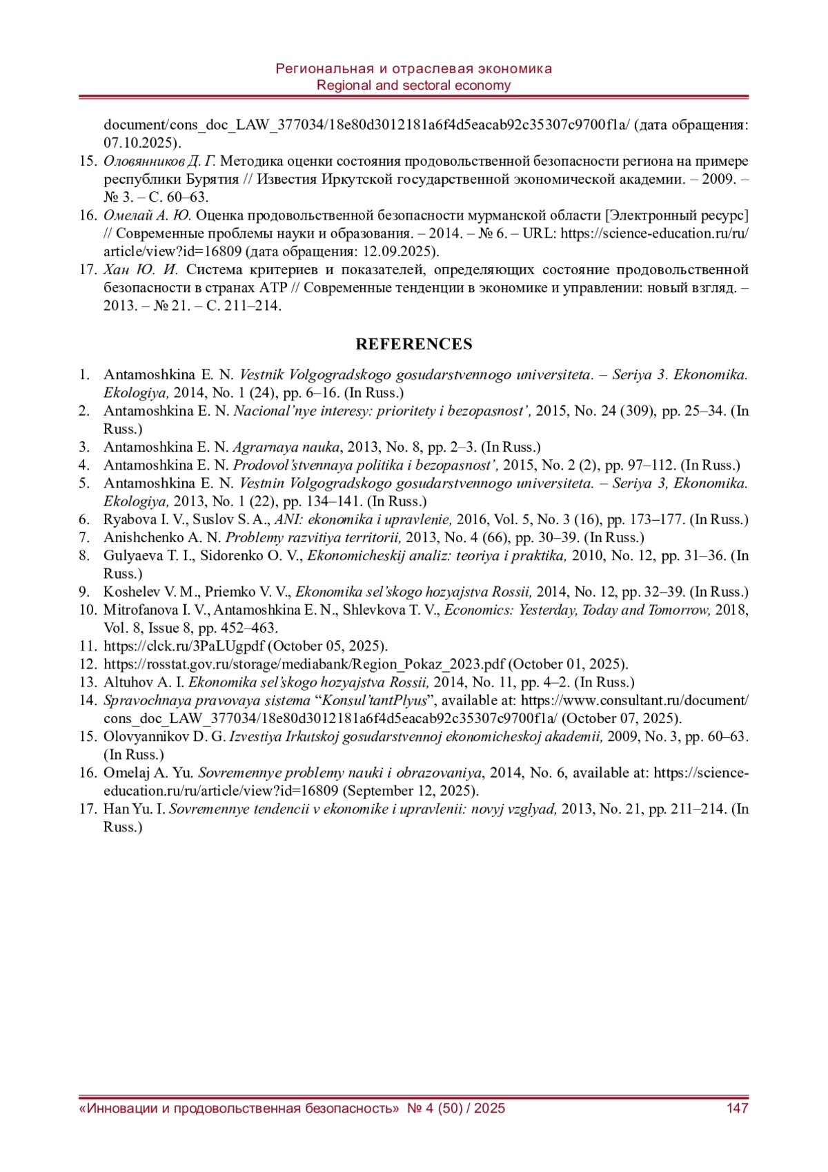 10. Митрофанова И. В., Антамошкина Е. Н., Шлевкова Т. В. Оценка продовольственной безопасности как направление социально-экономической диагностики региона университет // Economics: Yesterday, Today and Tomorrow. - 2018. - Vol. 8, Is. 8. - Р. 452-463.
